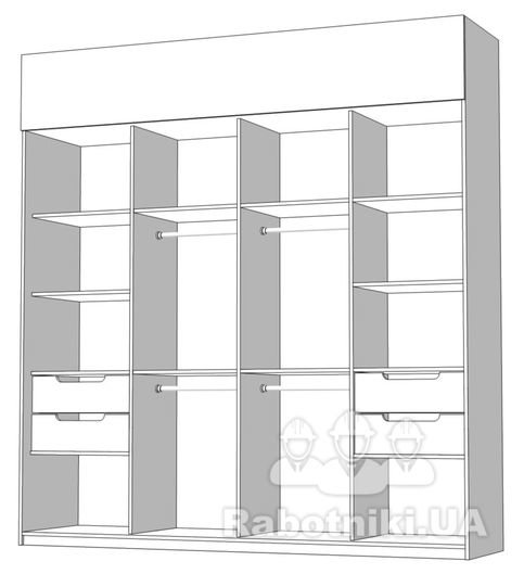 Желательно все полки расположить по уровням высоты, кратными друг другу. Т.е. пара ящиков суммарно по высоте должна равняться пространству под ними, соотв ящики + то пространство по высоте должны равняться пространству для одежды с вешалками и т.д.