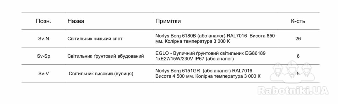 Постачання світильників відповідно до специфікації