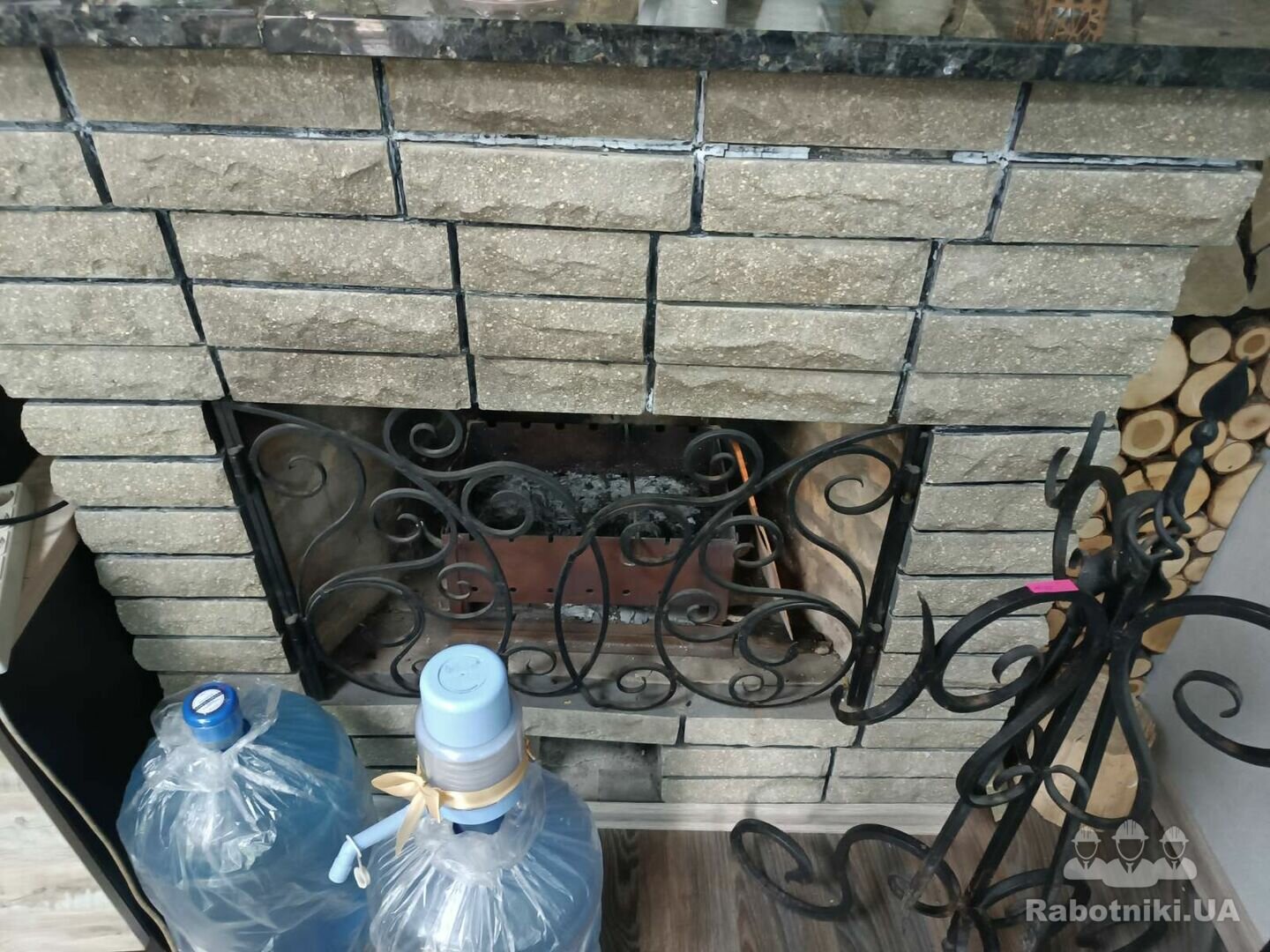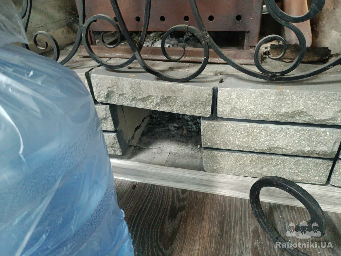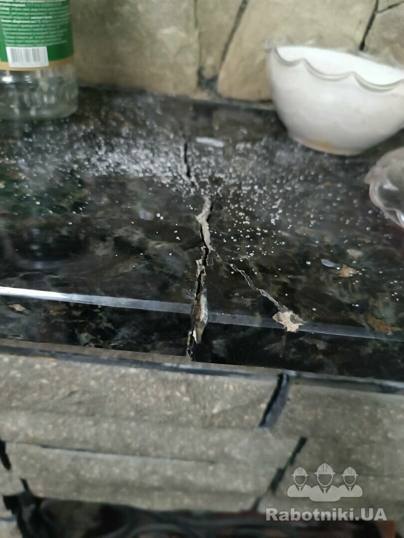 Частично снять облицовочний камень с камина, частино разобрать сам камин и переложить его, восстановить облицовоку. Устранить последствия проседания камина .