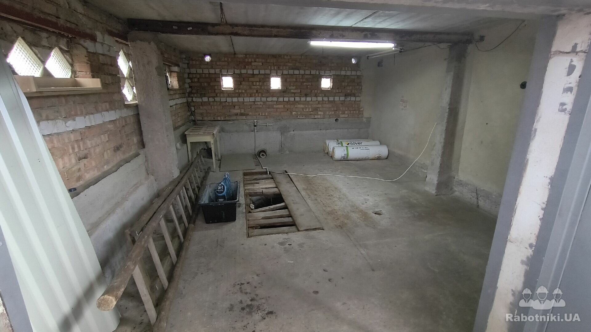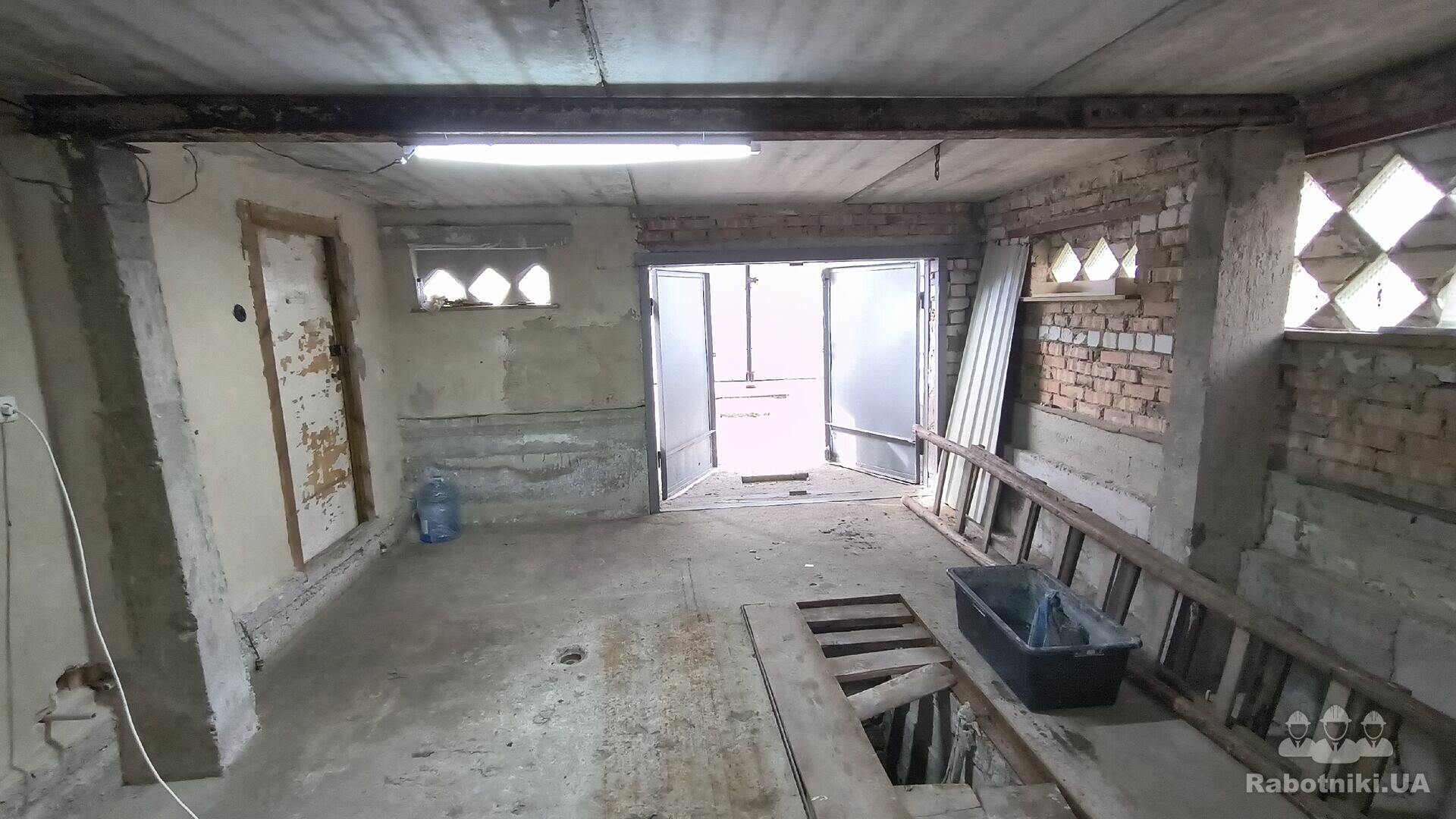 Добрий день. Потрібно зробити ремонт у гаражі що на фото.Стіни,стеля,світло, перегородку стінову ,та санвузол роздільний, розвести воду та каналізацію, яму оглядову: більшу частину зробити як звичайну підлогу та люк - ляду відкривний, щоб був доступ, бо в низу оглядової ями насосна станція, підлогу теж вирівняти.