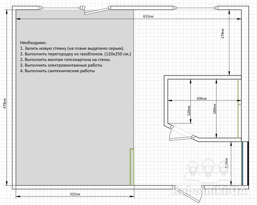 Однокомнатная квартира, 3 этаж 5-этажного дома, Ветряные горы. Площадь около 28 м2. Необходимо залить новую стяжку пола в комнате (15 м2), выполнить перегородку из газоблоков (120х250 см) Также необходимо выполнить электромонтажные и сантехнические работы, монтаж гипсокартона на стены.