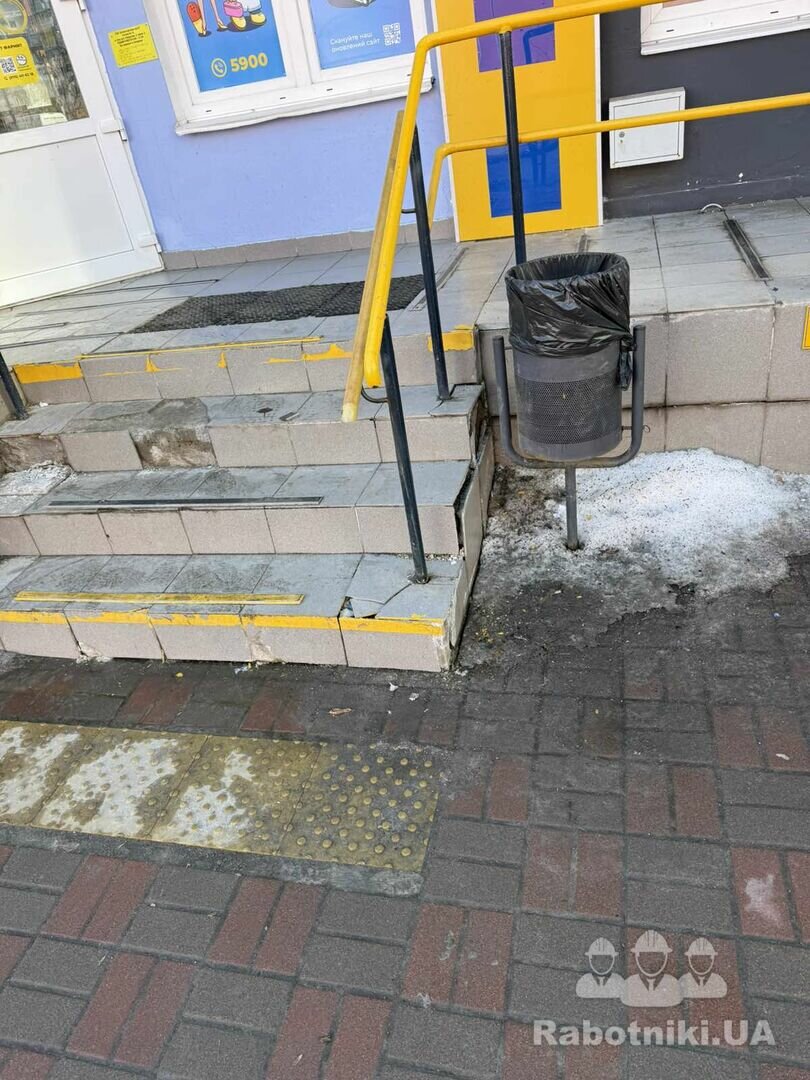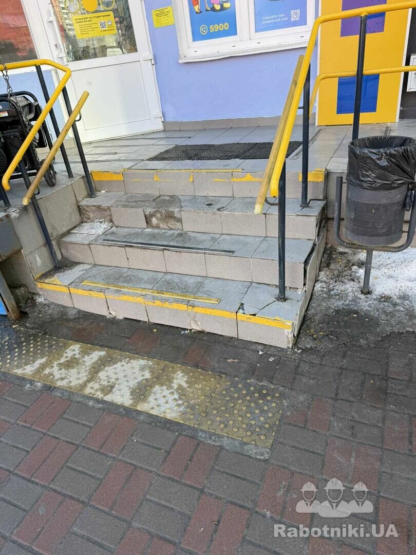 Заміна плитки на сходах орієнтвоно 8 м.п. та майданчику та боковій стінці ~ 2 м2.