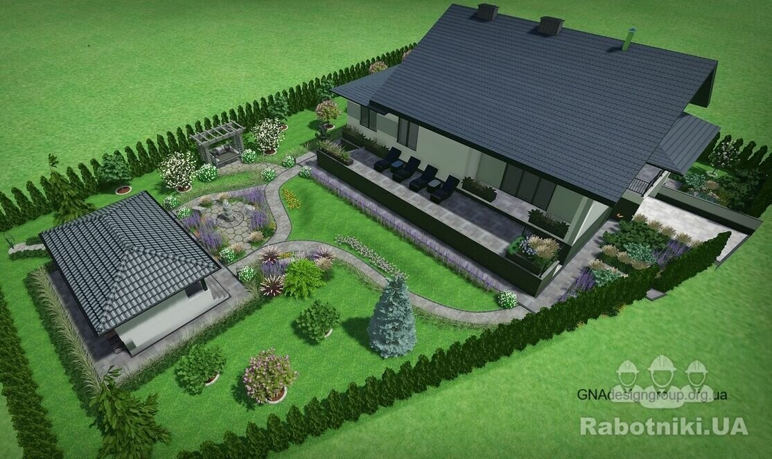 + розробку зонування/планування та проектування благоустрою території та Ландшафтного дизайна, вхідної/в їздної групи, тераси, навісу, різноманітних зон відпочинку, підбір рослин та тротуарної плитки, доріжок, моделювання індивідуальних локацій і т.д., 3д візуалізацію цього, 2д плани, освітлення (нічна версія) і т.д. 3д відео-ролик, 360 градусів панорами.