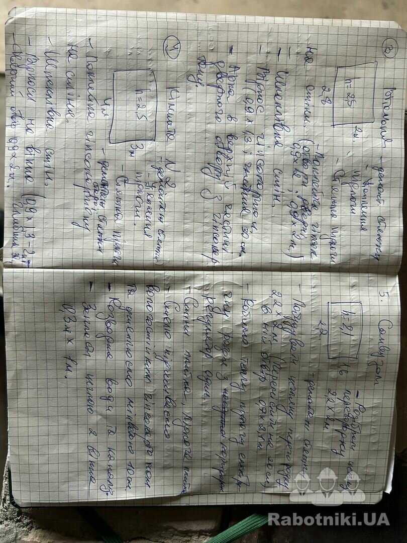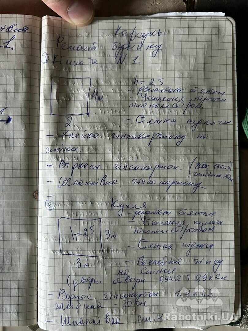 Матеріали на обʼєкті. Потрібно зробити ремонт будинку 44 м2(6 кімнат) Підготувати і встановити каналізаційні кільця 3 шт діаметром 1 м( привезе і поставить маніпулятор, потрібно тільки підготувати). Підвести до будинку- 6 м воду і каналізацію. Підлога- утеплена стяжка. Стіни-поклейка гіпсакартону, шпаклівка. Санвузол -плитка. Ремонт в кімнатах розписаний на листах.