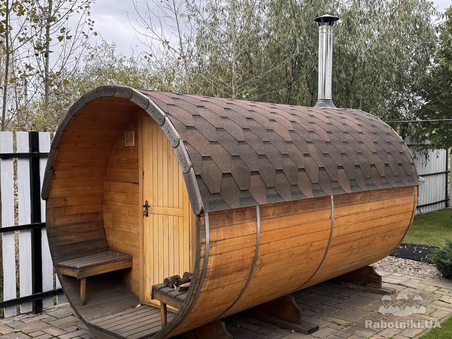 Є сауна-бочка, форма якої закріплена металевими обручами. Частина з них зіпсована та потребує заміни. Необхідно їх замінити та додати за необхідності. Потрібен майстер, що вже має досвід з саунами такого плану. Фото бочки додаю.