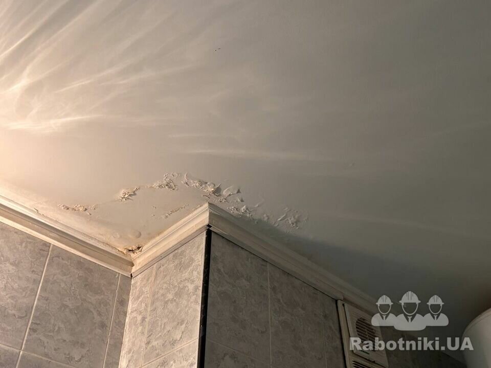 Треба відремонтувати стелю в санвузлі після підтоплення сусідами зверху. Бетон. Приблизно 5 кв м. Саме пошкодження невелике в кутку, але треба потім перефарбувати всю стелю. Район метро Лівобережна