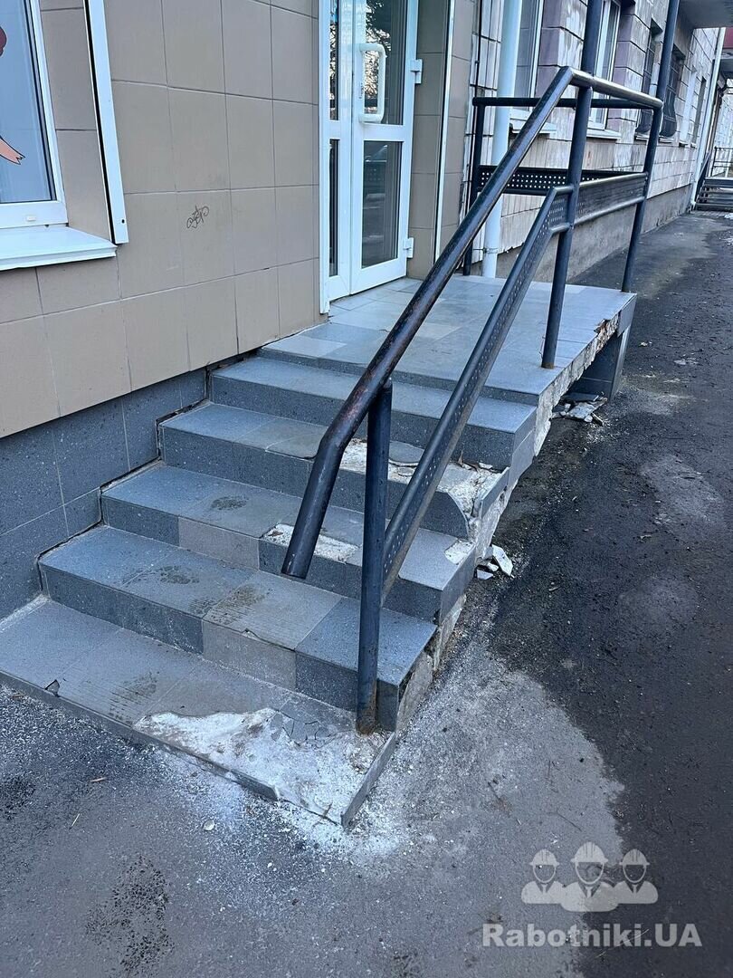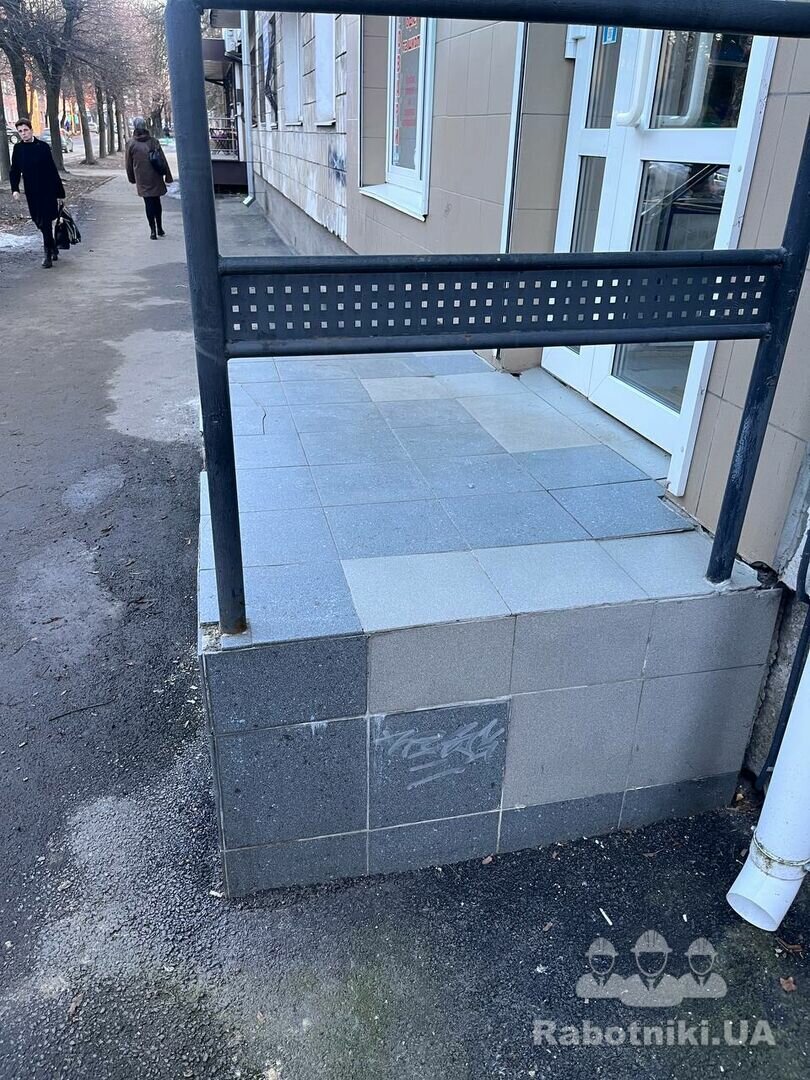 Добрий день. Вхідна група магазину. Розбивка кераміки з клеєм. Стяжка. Укладка плитки керамограніт. Заповнення швів. Оплата по безготівковому розрахунку.