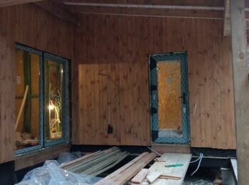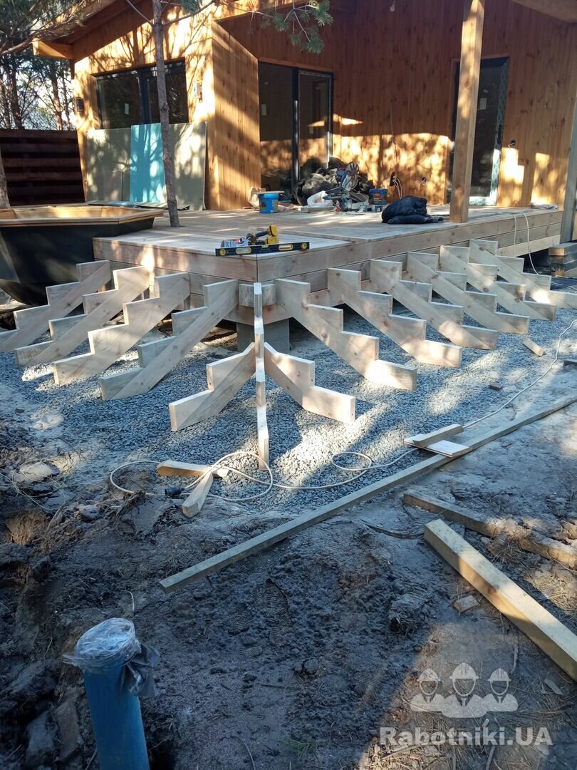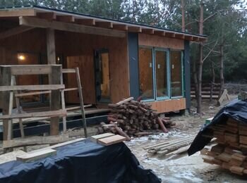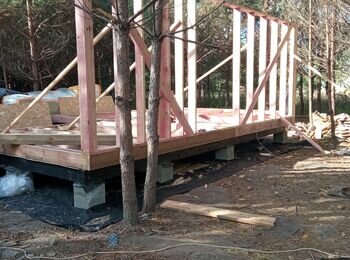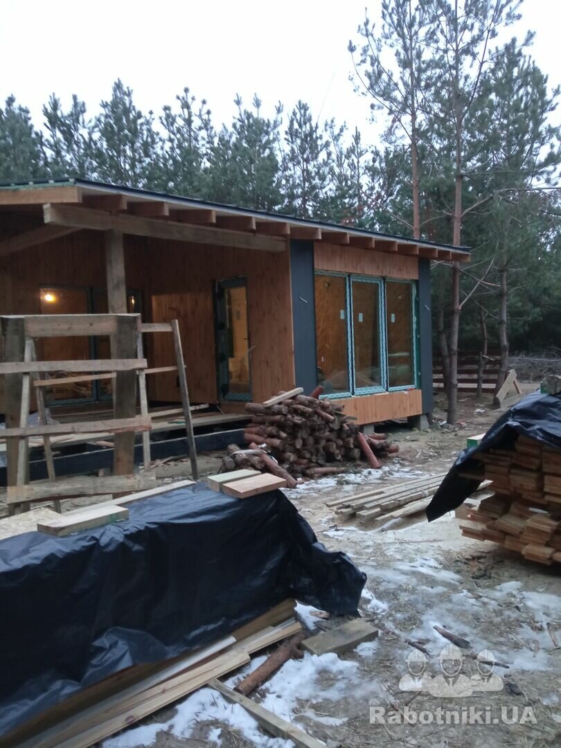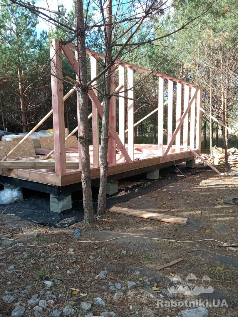 - монтаж свай винтових; зборка каркасу банхауса з антресоллю (45 кВ.м); утеплення, монтаж покрівлі; внутрішнє оздоблення.