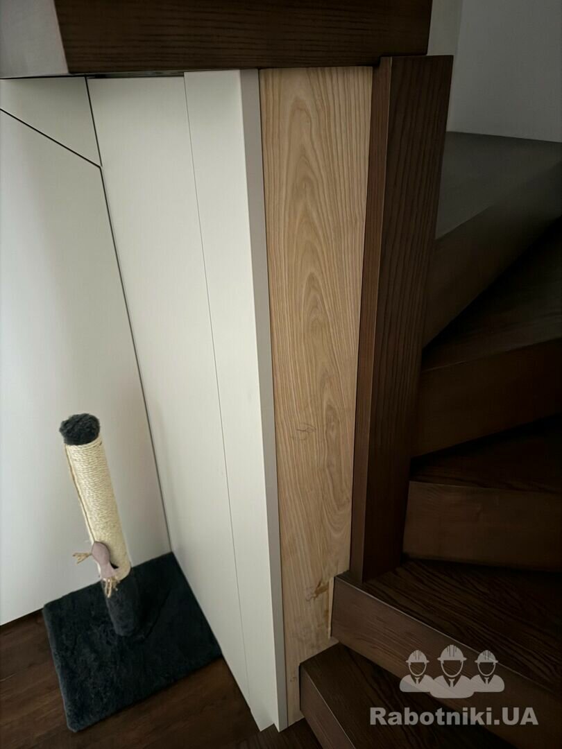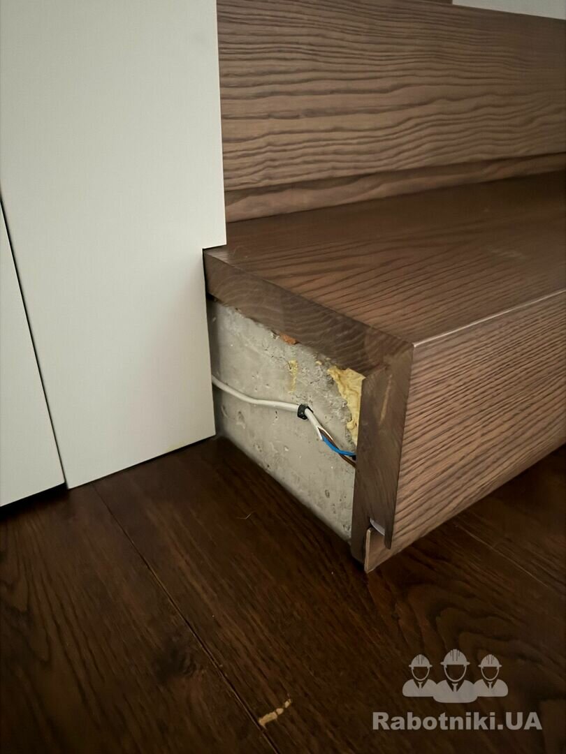 Необходимо вырезать из дерева две заглушки для лестницы затонировать в тон и установить