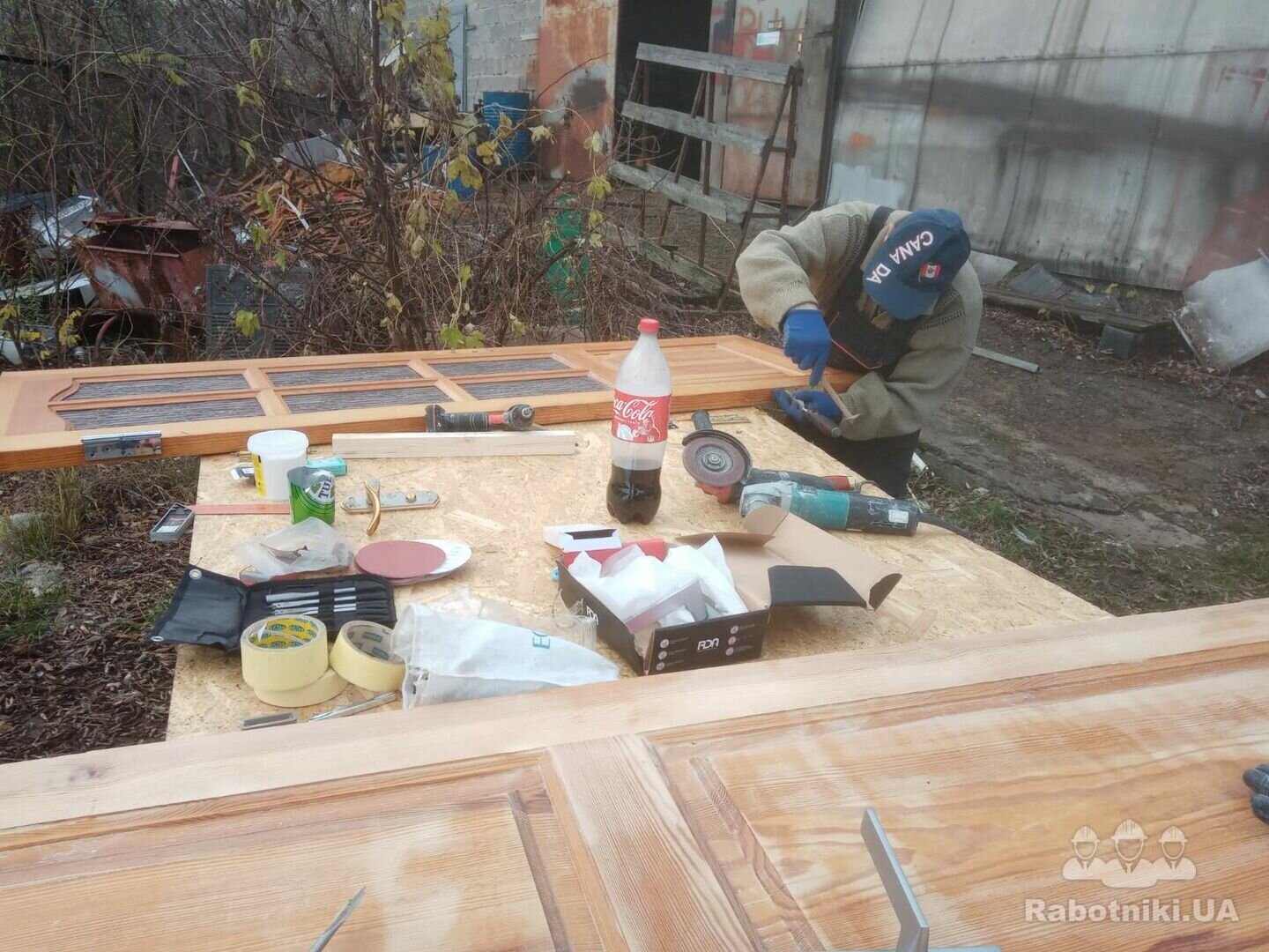 1. Шліфування деревяних дверей для видалення сажі та старого лакового покриття