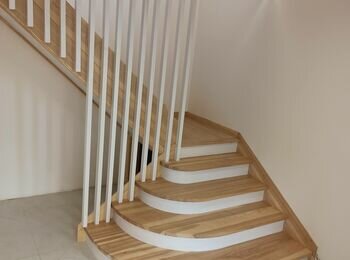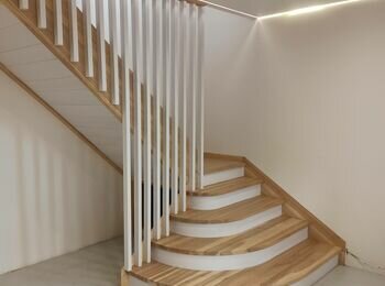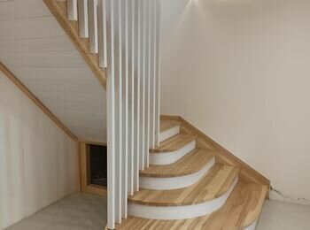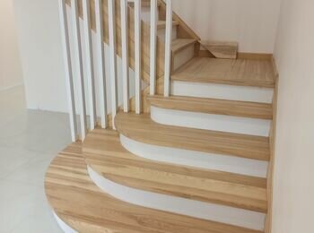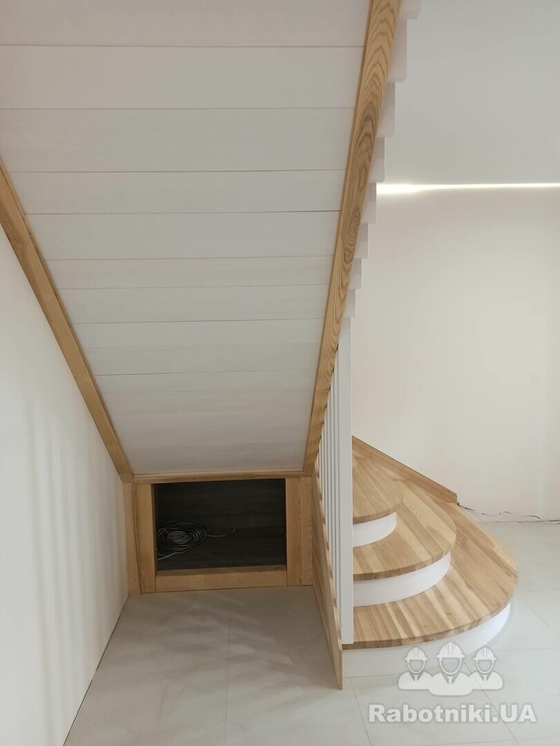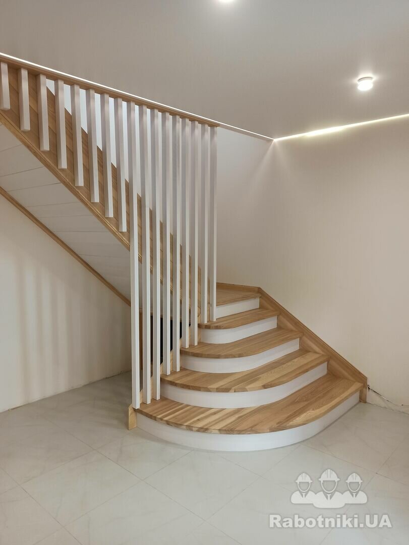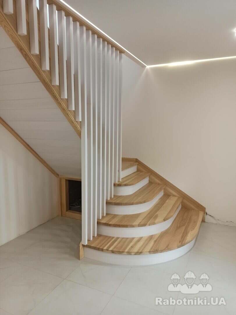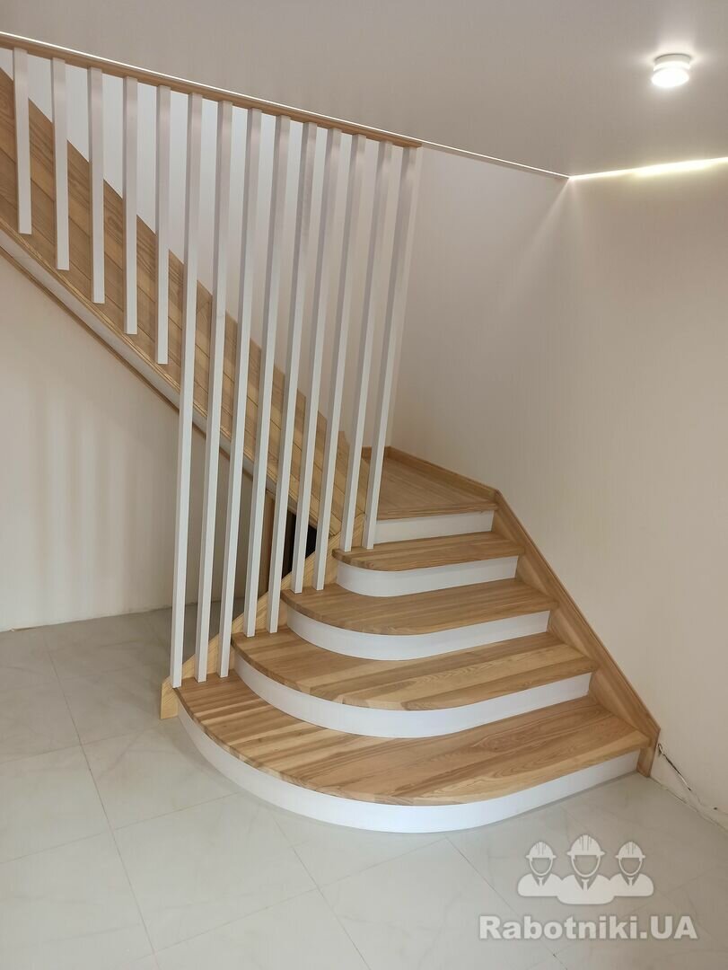 Пропоную сходи повністю з деревини ясен. Робимо у себе в майстерні. До вас їдуть сходи в зібраному виді. Попередньо треба зробити проєкт , та обговорити дизайн сходів.