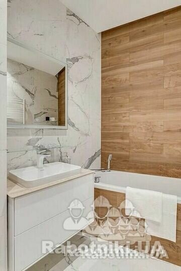 Потрібно покрасти штукатурку і покласти плитку в ванній та туалеті подібно референсу на фото