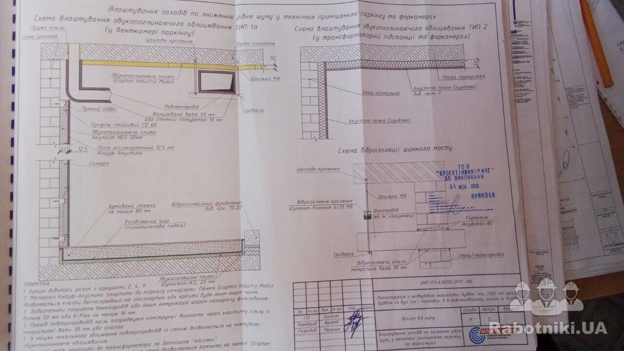 В вентиляционных комнатах необходимо сделать звукоизоляцию потолка и стен по двум типа звукоизоляции. Потолок тип 1 - звукоизоляционная плита 30 мм,монтирующаяся к потолку с помощью клей пены и механической фиксации дюбелем. Стоимость м 2 работы 70 грн м2. .Звукоизоляция стены по типу 1-формирование простенка 62,5 мм,на каркасе из уд-28 и цд 60 профилей,с закладкой внутрь звукоизоляционной ваты и обшивкой в один слой ГКЛ Кнауф Акустик 12,5 мм. ,по типу звукоизоляции W 111.Стоимость работы 150 грн м2. Работы по звукоизоляции тип 2 пока не проводятся. Ориентировочное количество работ 600 м2 Расчёт поэтапный. Павел