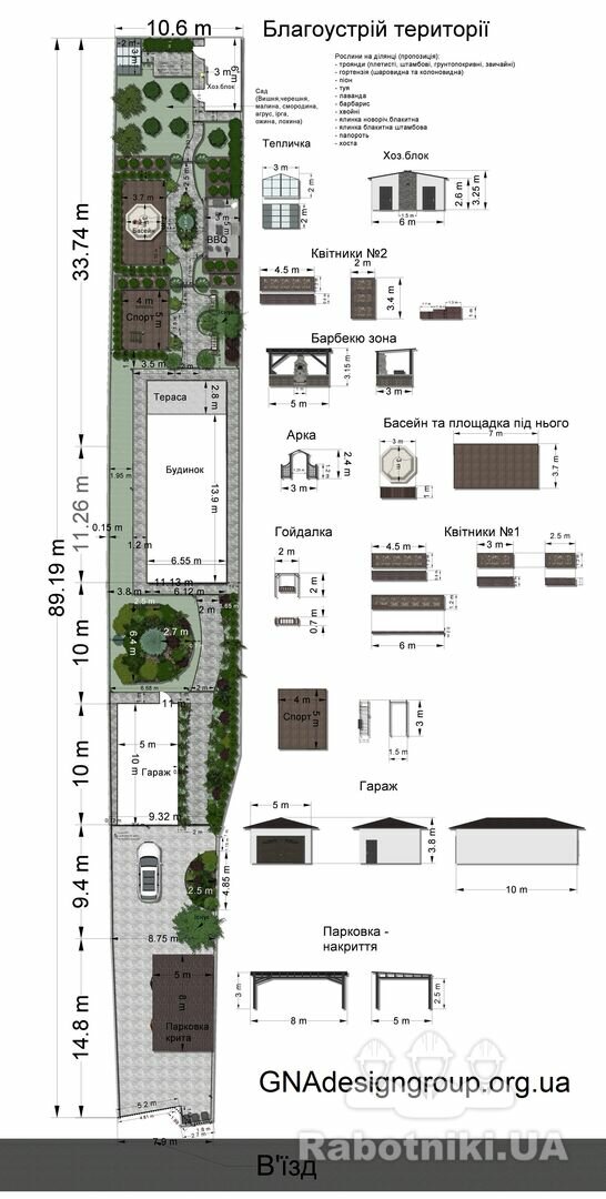 + розробку зонування/планування та проектування благоустрою території та Ландшафтного дизайна, вхідної/в їздної групи, зони барбекю, різноманітних зон відпочинку, підбір рослин та тротуарної плитки, доріжок, моделювання індивідуальних локацій і т.д., 3д візуалізацію цього, 2д плани, освітлення (нічна версія) і т.д. 3д відео-ролик, 360 градусів панорами.