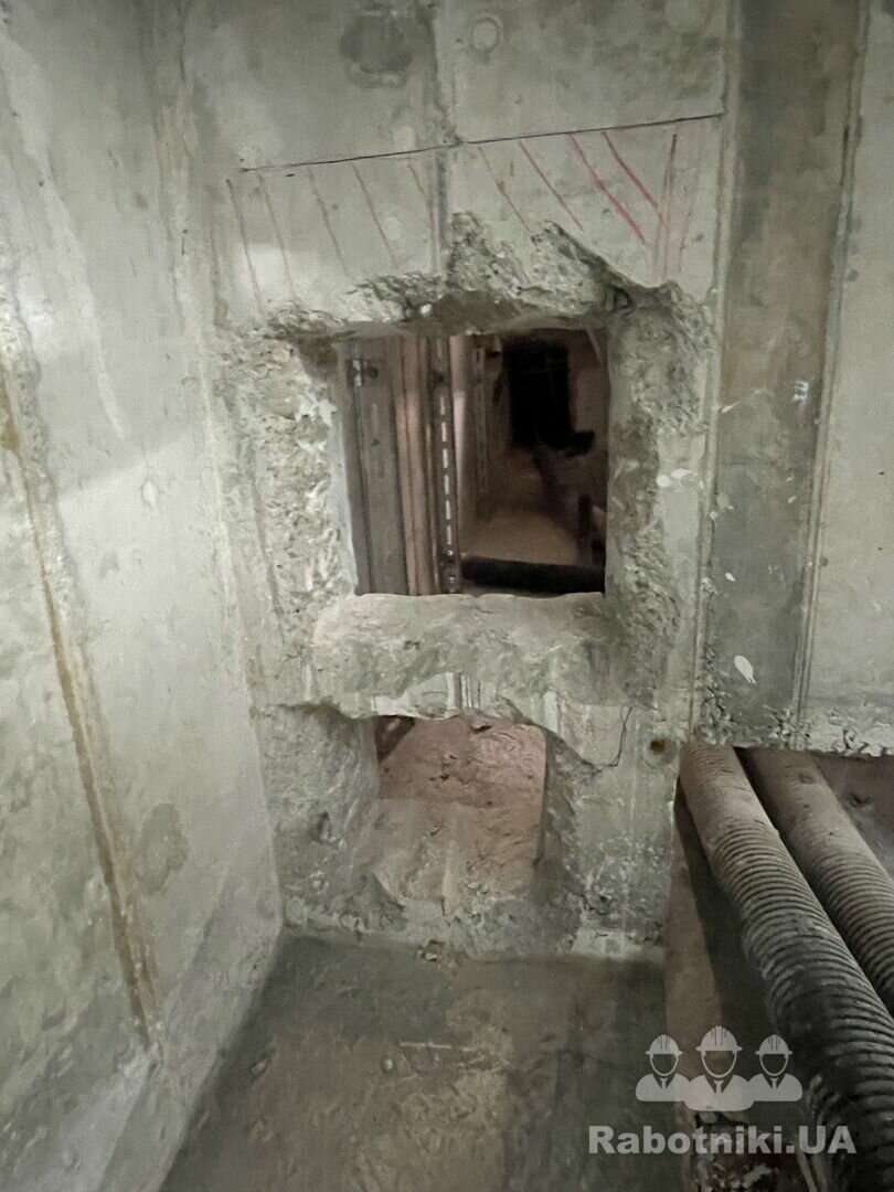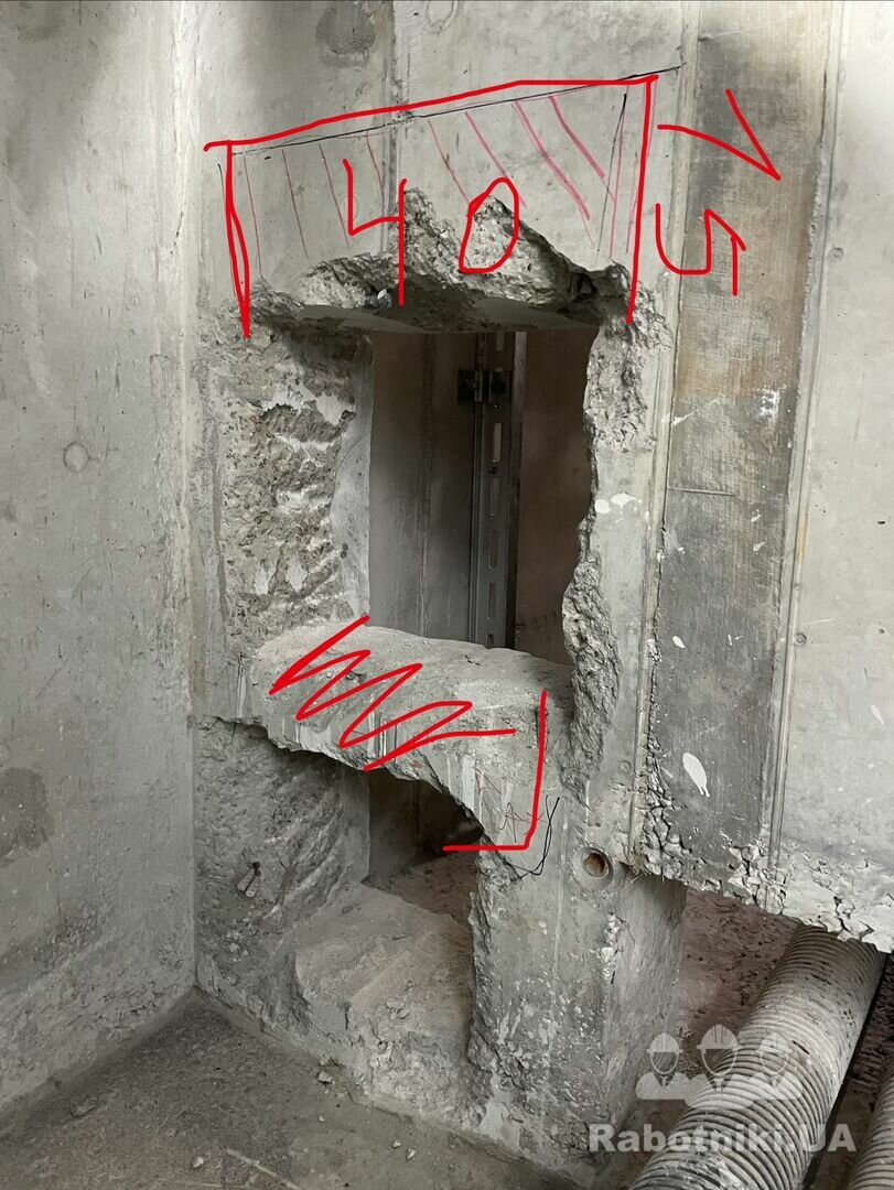 Потрібно розширити проєм в з/б стіні товщиною 250 мм., розміри на фото вказані в сантиметрах, за додатковою інформацією та обговорення бюджету - телефонуйте.