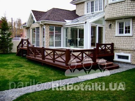 нужно сделать балкончик на террасе из дерева. стоит готовая бетонная плита , 10*3 м нужно сделать ограждение по периметру . первый этаж , пристройка к дому, на уровне цоколя , высота 1метр над землей. киев, осокорки дачи, 3 км от метро славутич предложите цену и сроки , также цену за материалы. примерное фото во вложении