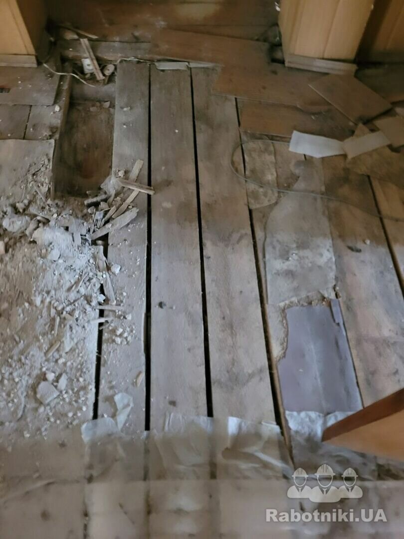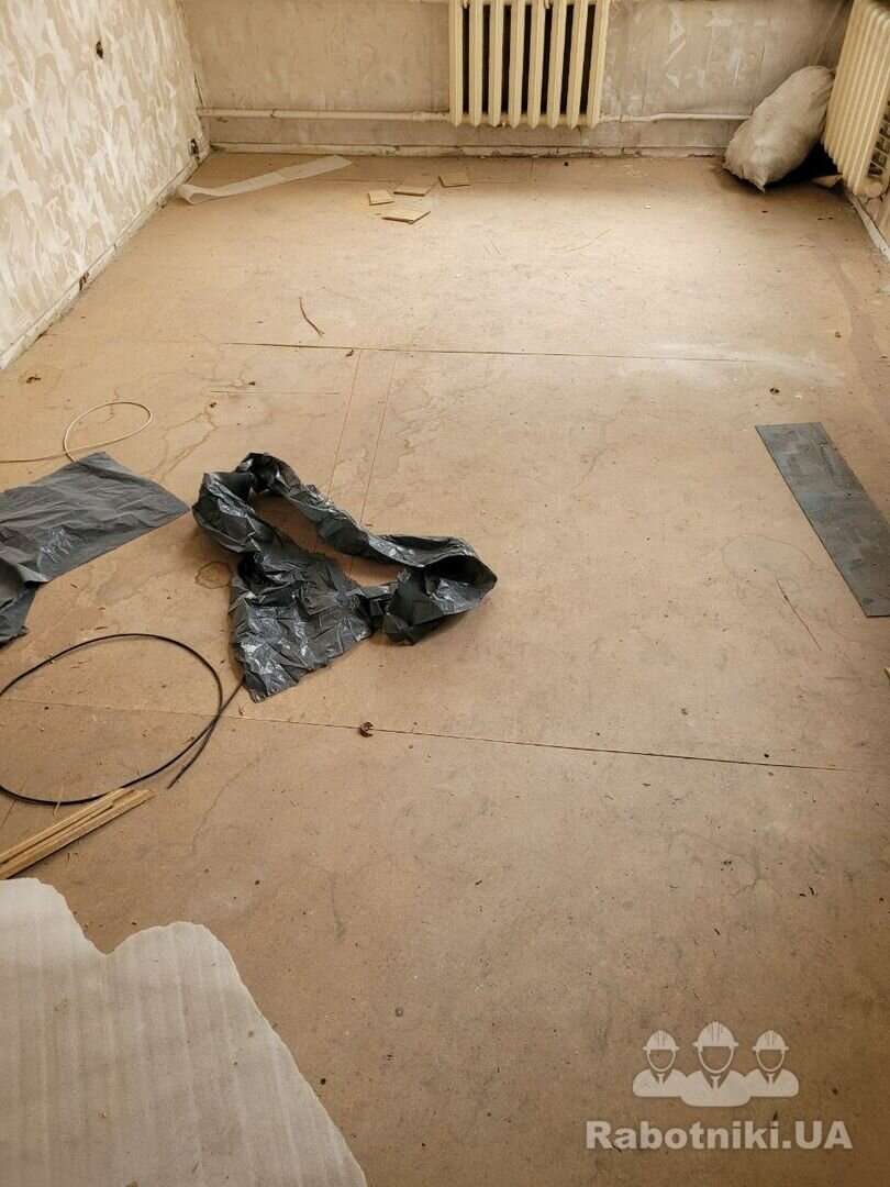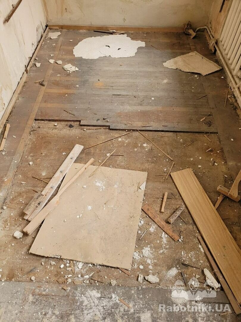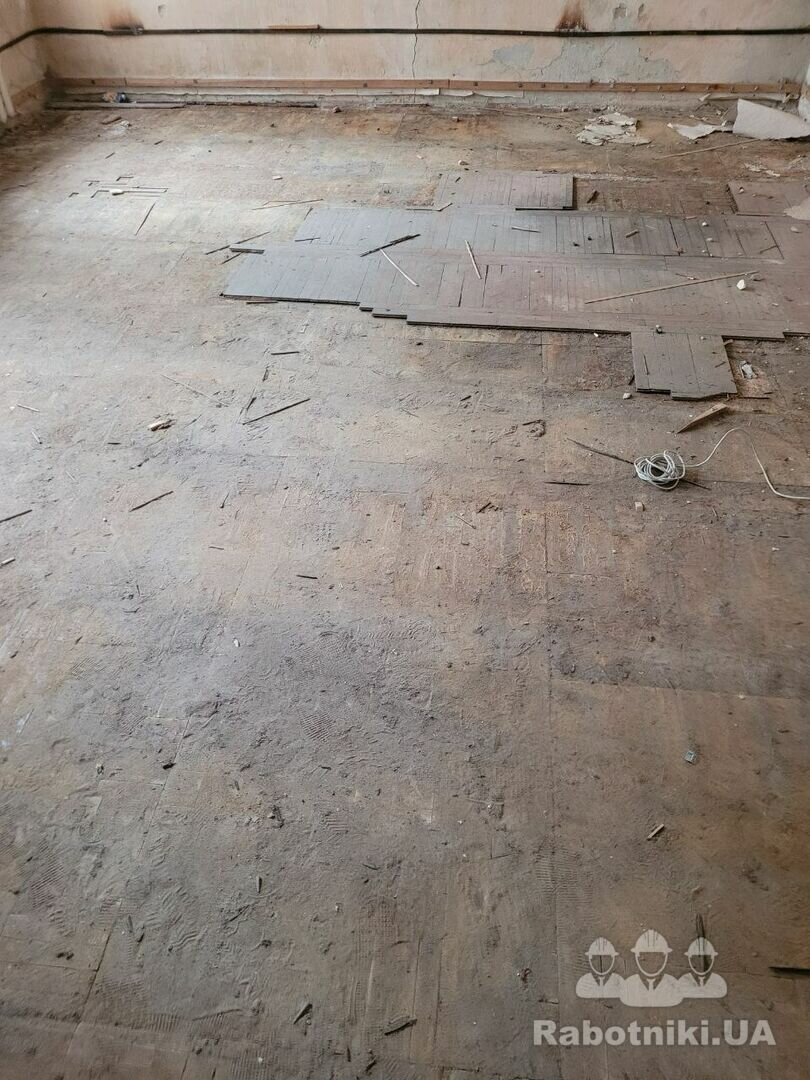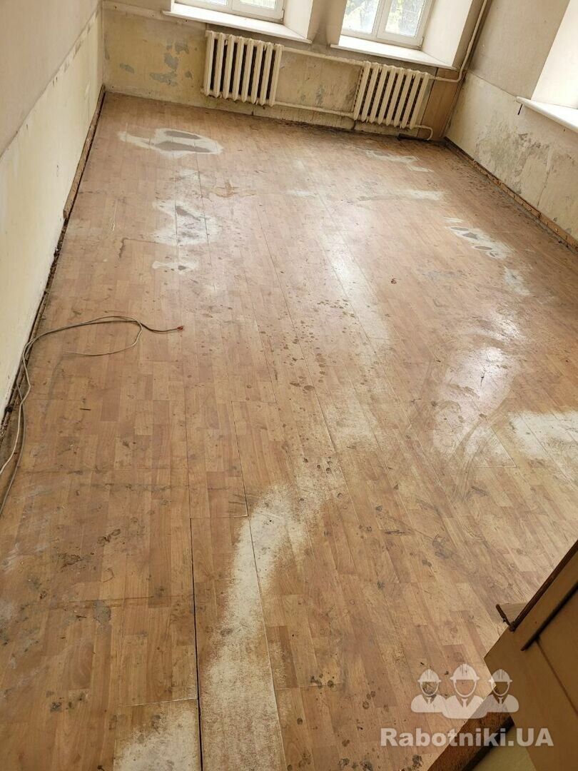 Реконструкция старого здания.Снимаем старое покрытие,после выравниваем деревянные полы по лагам,далее фанера и промышленный линолеум.