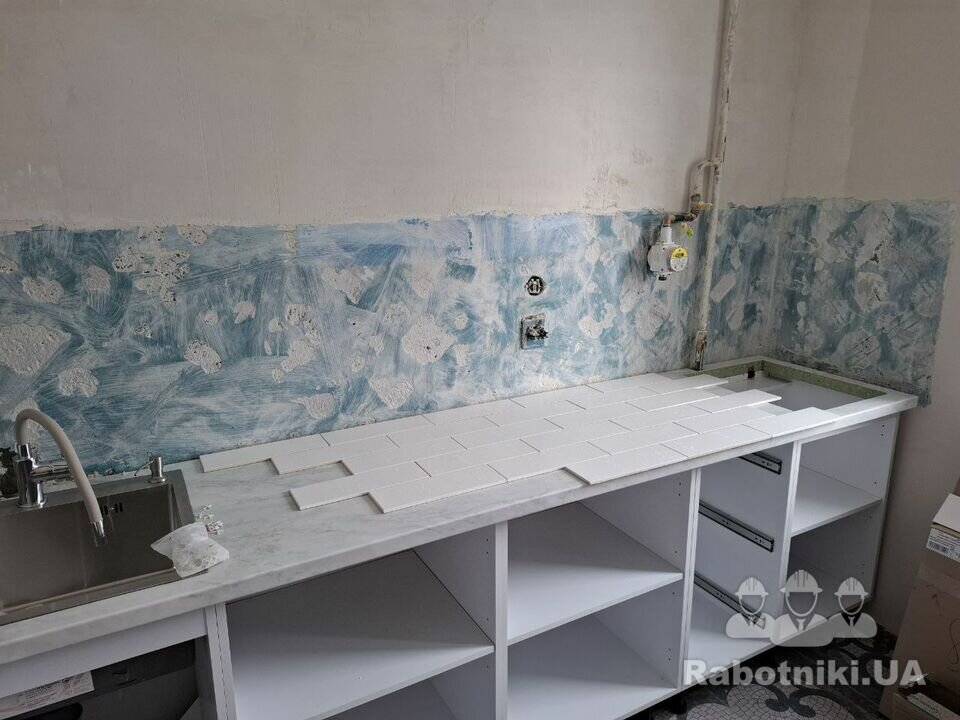 Необхідно укласти 2.52 м2 кухонного фартуху білою плиткою 10 на 30 звичайною укладкою (під цеглу). Стіна буде погрунтована, плитка куплена, необхідно докупити клей для плитки.