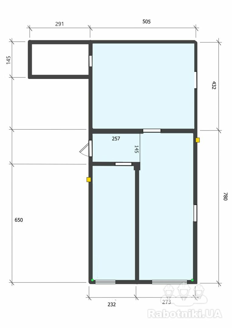 Площа роботи загалом : 62 кв.м ( коридор 3,7кв.м, 3 кімнати по 15 кв.м, 21,3 кв.м та 22 кв.м відповідно)