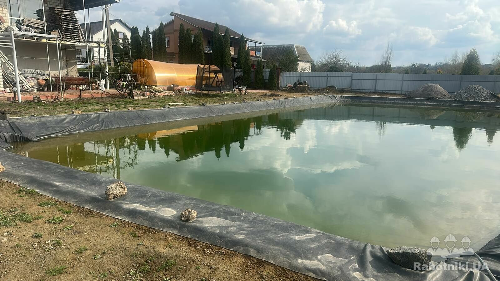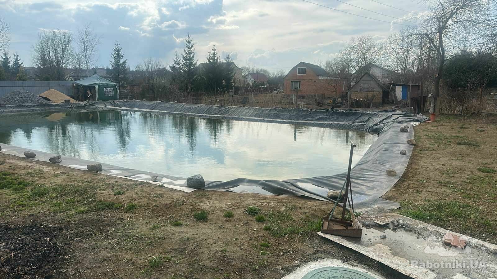 Укладка бут Ямпільского пісчаніка по периметру ставка 27м*17м розміром ширина 0.50*0.50м. укладка 20 м3.Укладка плитки з пісчаніка 120 кв.м.на суміш цементу та піска.Облаштуваня водоспаду 2.5*3м,облаштуваня 7 сходинок.