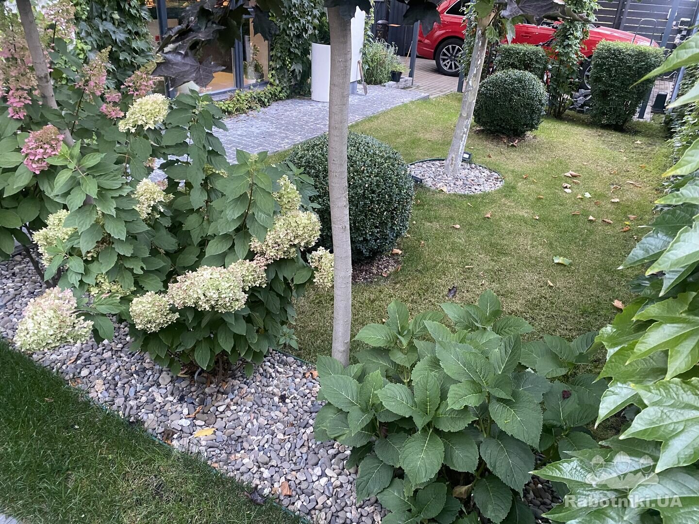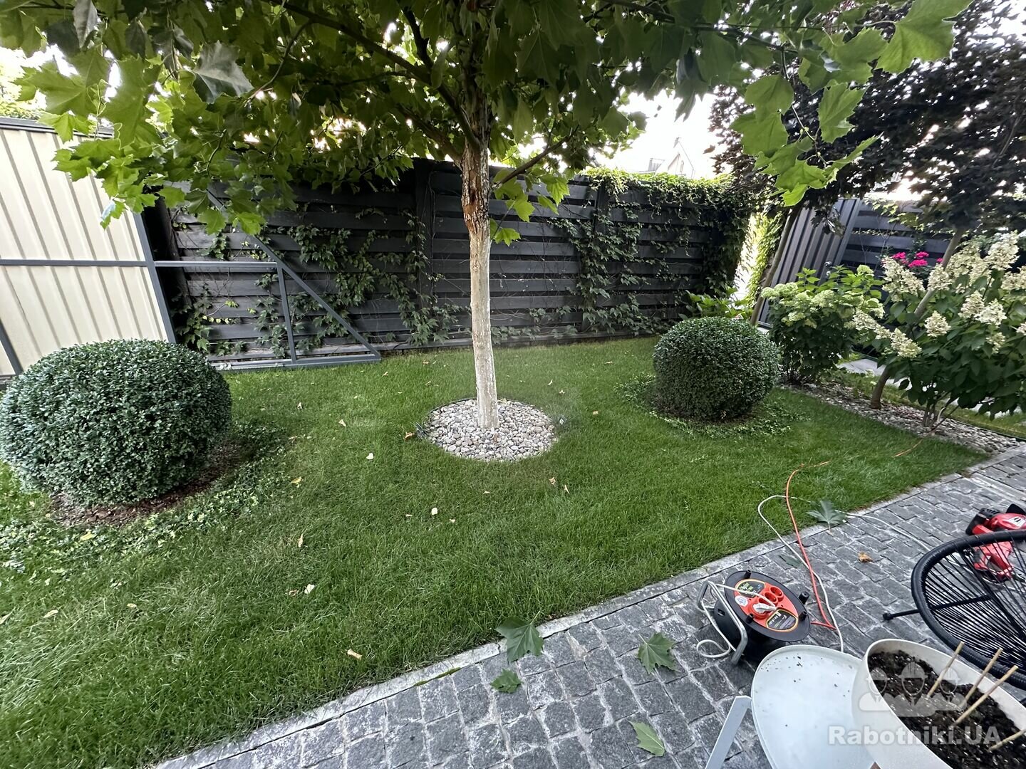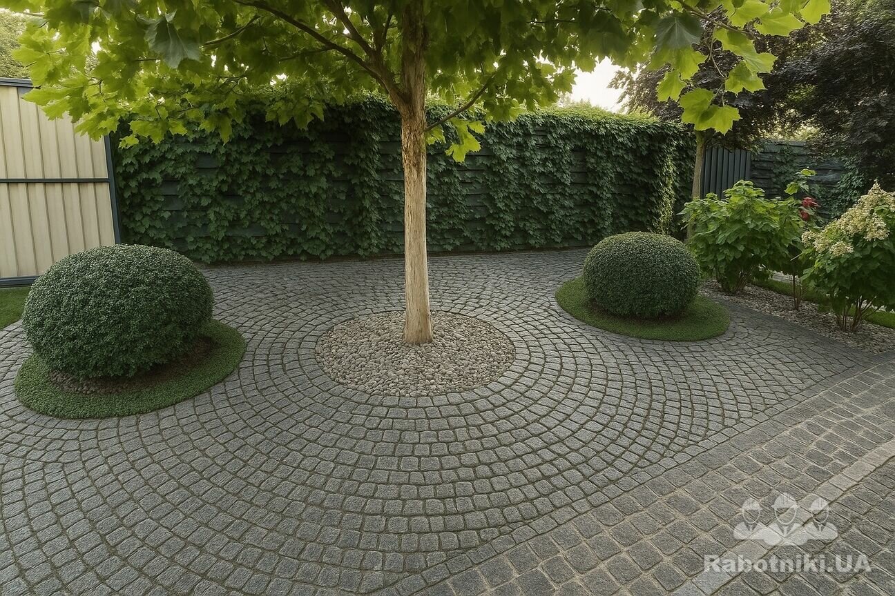 Бруківка укладається веєрно, так, як вказано на фото, з можливими виправленнями під час установки. Головне - навкруг дерева і кущів - укладка концетричними колами і від дерева і на далі все йде концентричними колами-хвилями. НЕ прямокутна кладка. НЕвеличкий нахил до паркану для можливості стікання дощу. Там вкінці встановлення спеціальних жолобів вздовж паркану для виводу води.