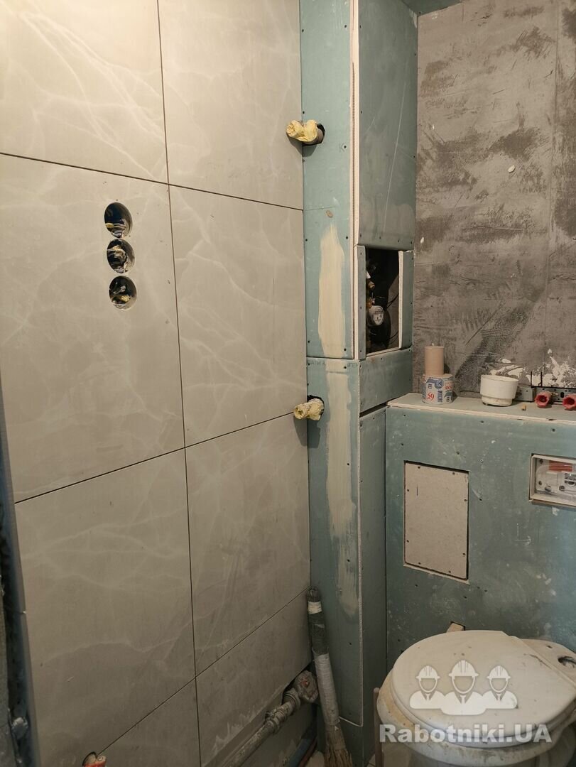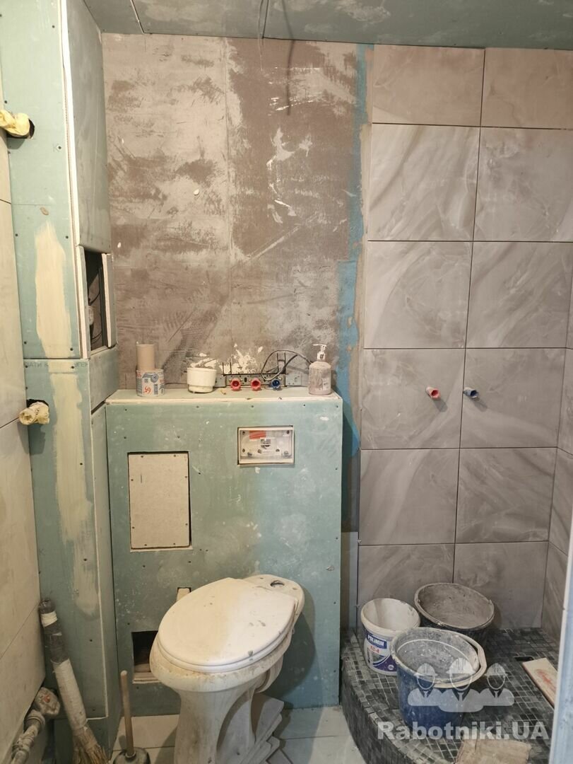 Закончить укладку плитки в ванной. Сделать затирку швов на полу. Предыдущего мастера забрали тцк.