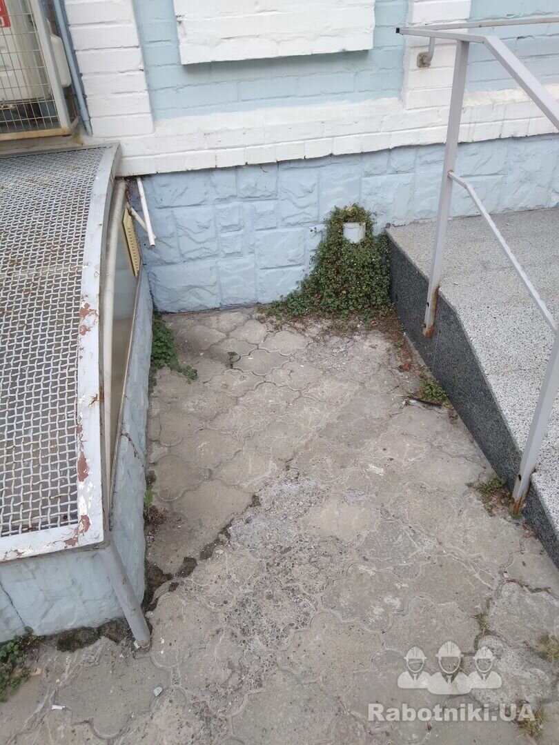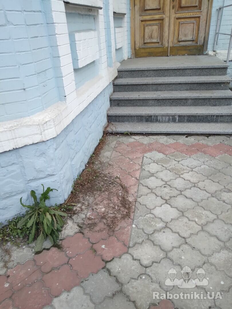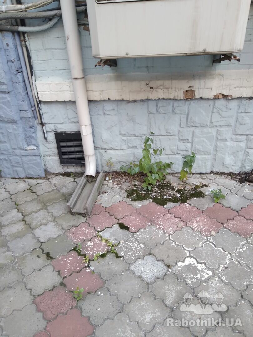 7. Вирівнювання бруківки з встановленням водовідведення від цокольної частини.