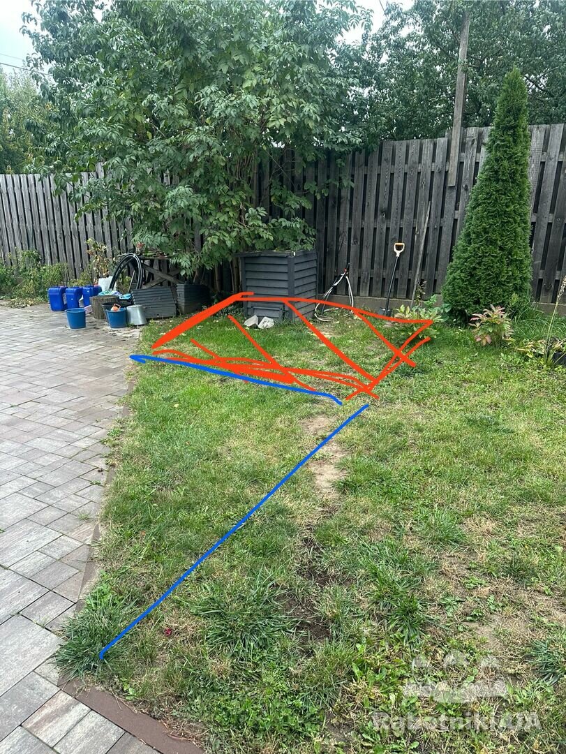 нужно забетонировать плиту 3,50х2,30 под будущий пластиковый сарай, предварительно очистив место от травы/кустов (красный прямоугольник на фото).