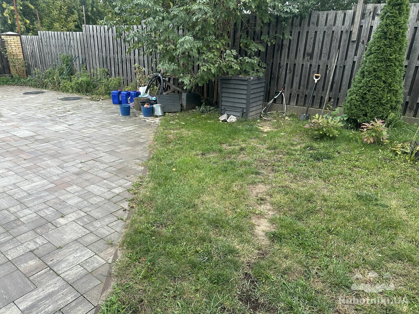 также нужно перенести бордюры и уложить тротуарную плитку на пути в будущему сараю (синий треугольник на фото)