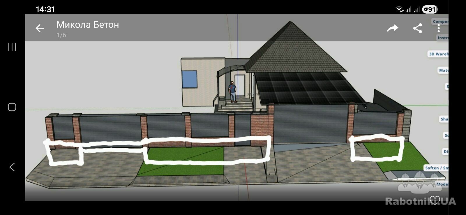 Потрібно побудувати паркан (бетонна стрічка, цегляні стовпчики та профнастил).