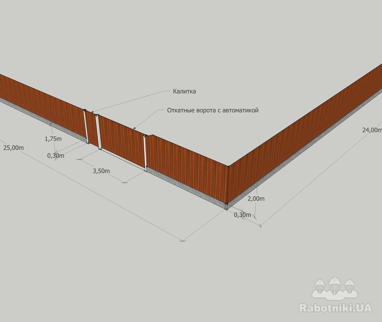 Добрый день! Необходимо выполнить около 50 погонных метров забора. Фундаментная лента + стойки, откатные ворота с автоматикой, калитка. Все ваше, за исключением профлиста - мой. Ваша цена? На участке есть около 26 метров опалубки (осталась от заливки армопояса).