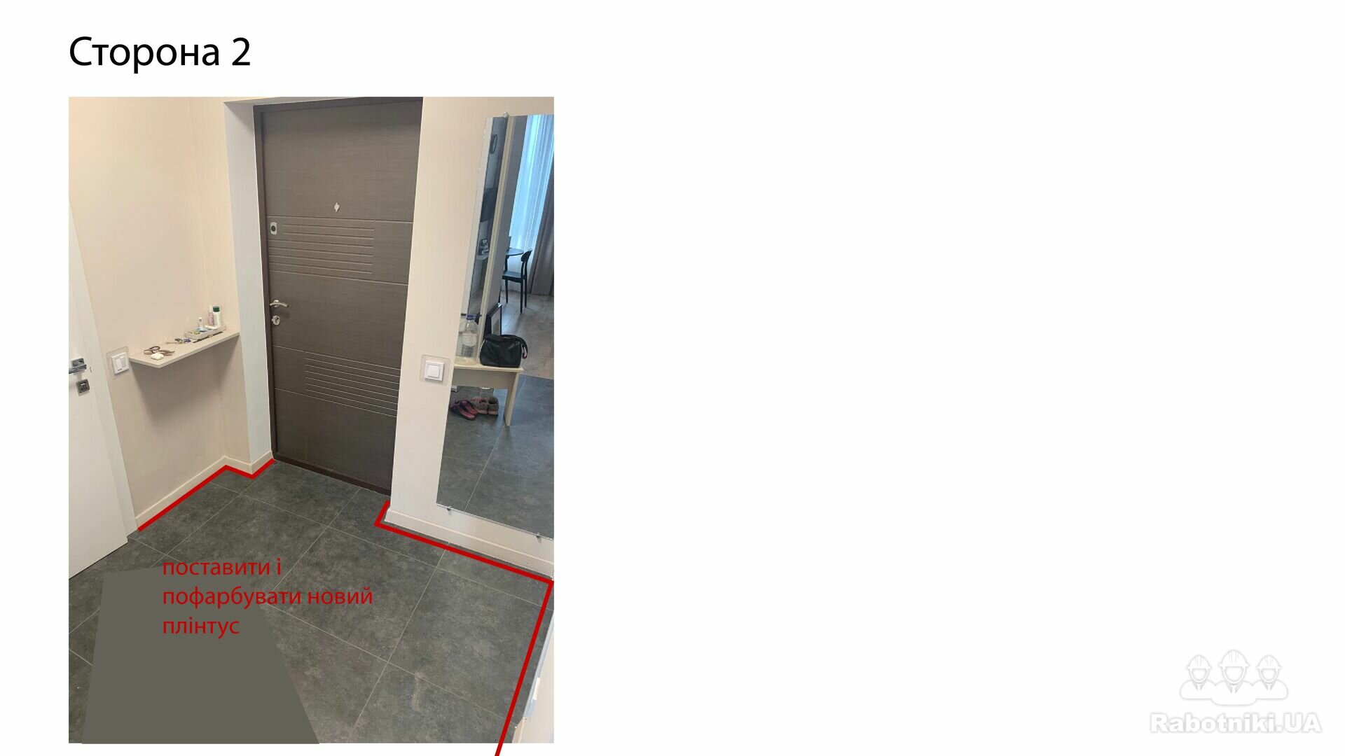 Монтаж плінтуса з обох сторін стіни. (Приблизна погонна довжина плінтусу з однієї сторони - 5500 мм, приблизна довжина плінтусу з іншої сторони - 7000 мм, тягнеться до передпокою). Плінтус орієнтовно дюрополімерний, монтаж вірогідно на клей, зарізка кутів та стиків під 45*.