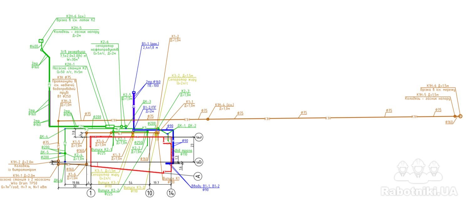 1. К1Н Мережа напірної каналізації; 2. К1 Мережа побутової каналізації; 3. В1 Мережа питного водопроводу + водомірний вузол; 4. К3 Мережа виробничої каналізації; 5. К2 Мережа дощової каналізації; 6. К2Н Мережа напірної дощової каналізації.