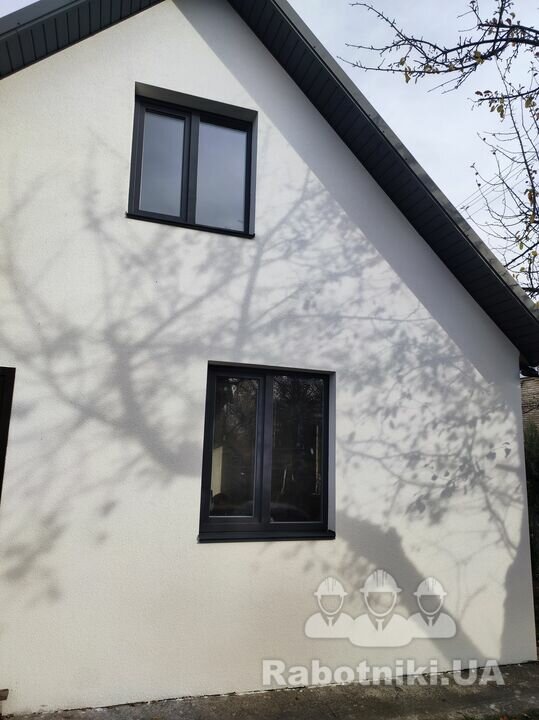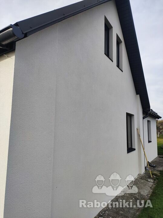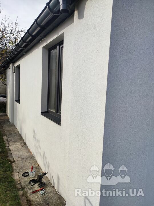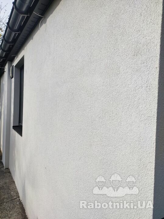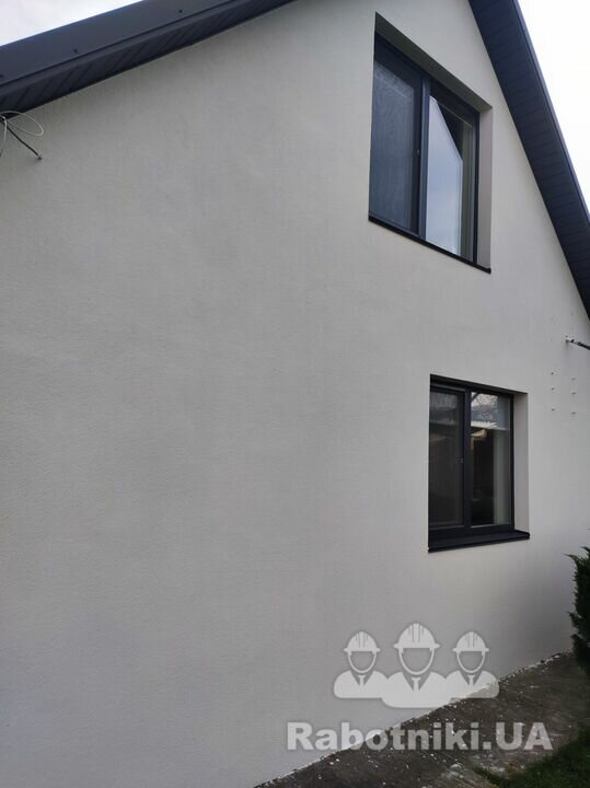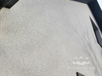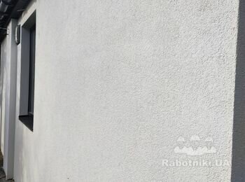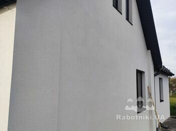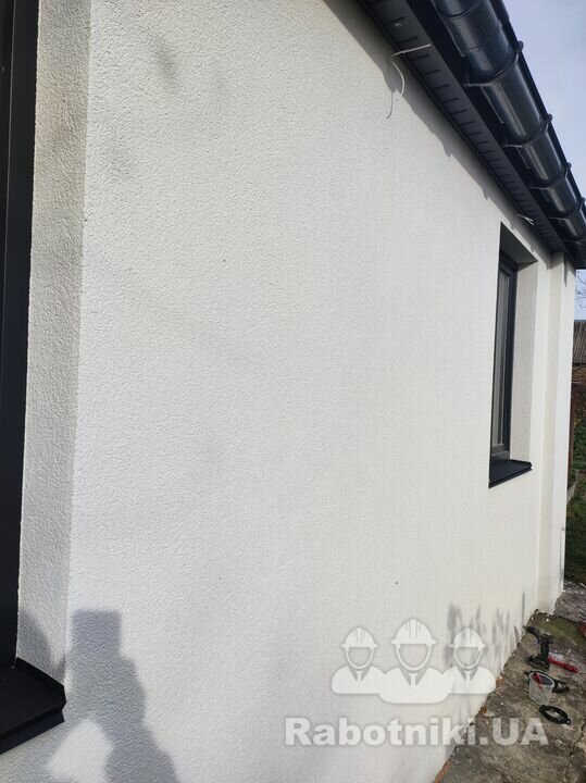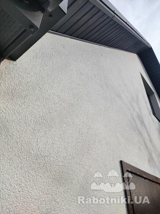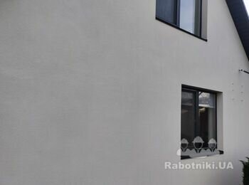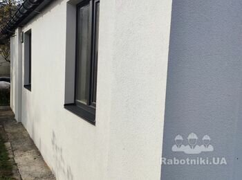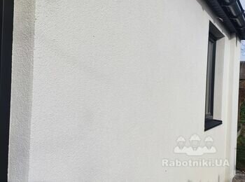 Завдання було декоративна штукатурка фасаду "баранець", сумарно 110м2+відкоси, декоративні колони. Обрав їх, бо побачив фото робіт та якість, які мені сподобалися. Три зовсім молодих хлопця, спокійні та дуже порядні. Всю роботу виконали за 2 дні (перший обклеювання всіх примикань, підшиви, вікон тощо та грунтування кварц-грунтом, другий - власне штукатурка). Все виконали на відмінно! За собою все прибрали, майже не довелося щось там чистити та мити. Працюють зі штукатуркою дуже економно, з відра 25кг штукатурки витягують 10+м2. Це чудовий результат! Показую фото не здалека, як всі, а спеціально окремі ділянки, щоб було видно якість примикань, фактуру поверхні, повну відсутність будь яких плям та переходів. Дуже задоволений роботою!