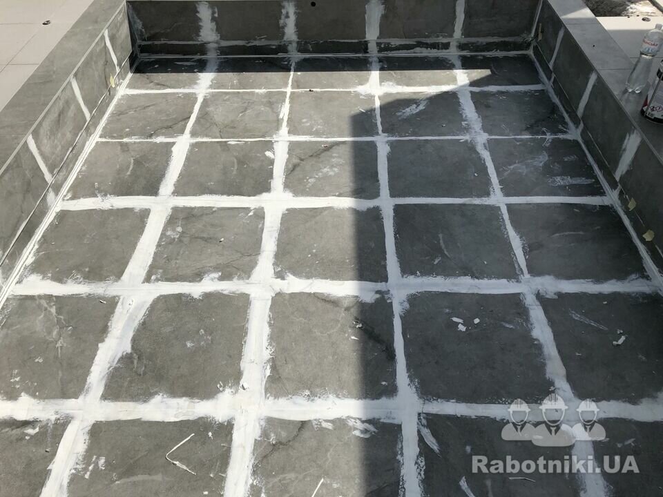 Проблема была в том, что через швы и примыкания вода вытекала с бассейна. Без демонтажа, все швы и примыкания были проработаны полиуритановым герметиком и поверх плитки нанесена полиуритановая гидроизоляция с декоративной посыпкой.
