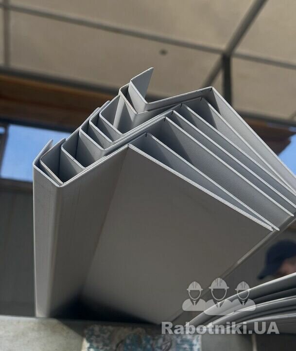 Приклади кутиків, планок та інших нестандартних виробів, які ми вирізали та зігнули за кресленнями наших клієнтів. Тут представлені готові елементи з ПВХ-, ТПО- та ПЕ-металу, що демонструють точність виконання та високу якість гнуття. Надихайтеся та замовляйте вироби за власними розмірами!