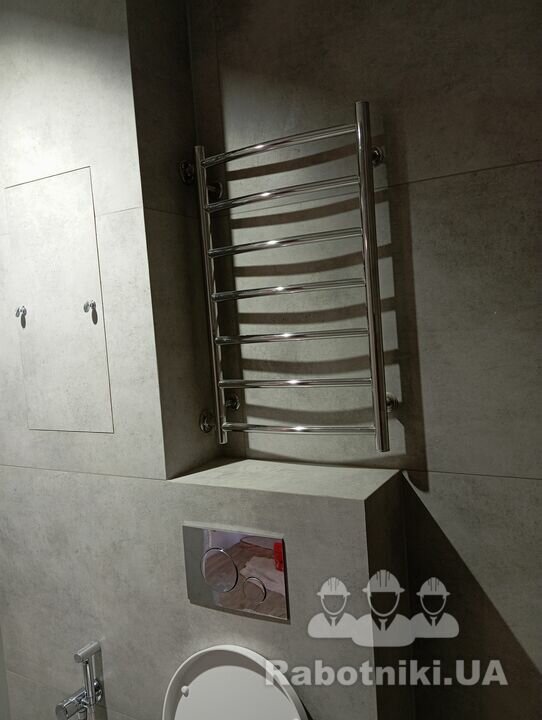 Был реализован проект санузел, фартук,и пол в коридор Было выполнено демонтаж, замена канализационной трубы ,электрика , сантехника, малярные и плиточные работы ,