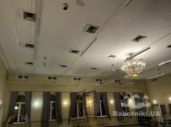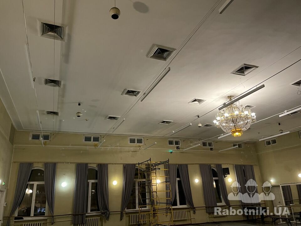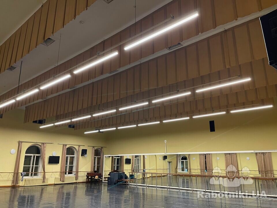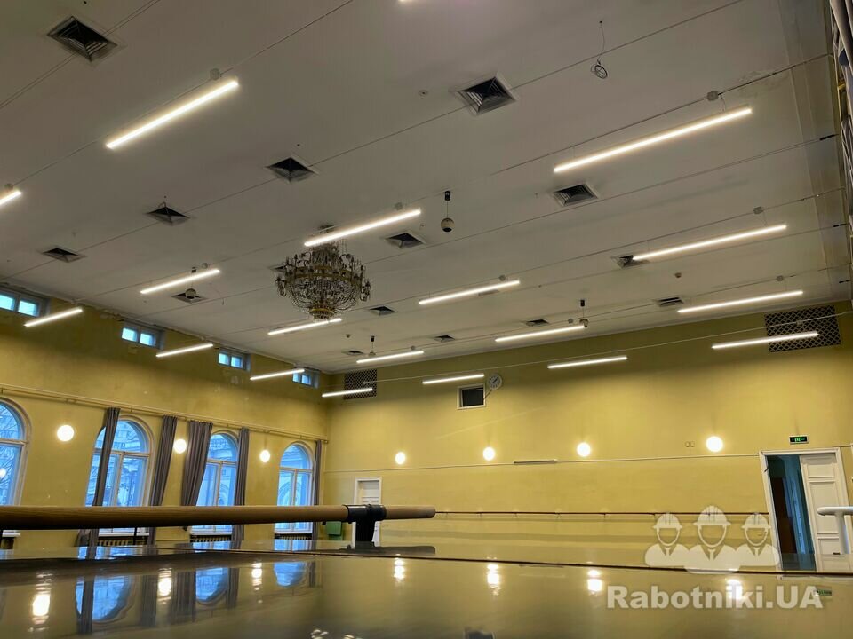 В одному з залів реалізовано повний цикл робіт з нуля: змонтовано систему освітлення з кріпленням на тросах акуратно, технологічно та з урахуванням особливостей приміщення.