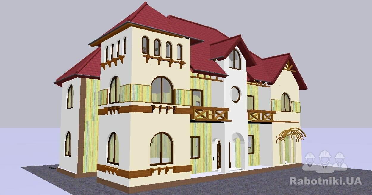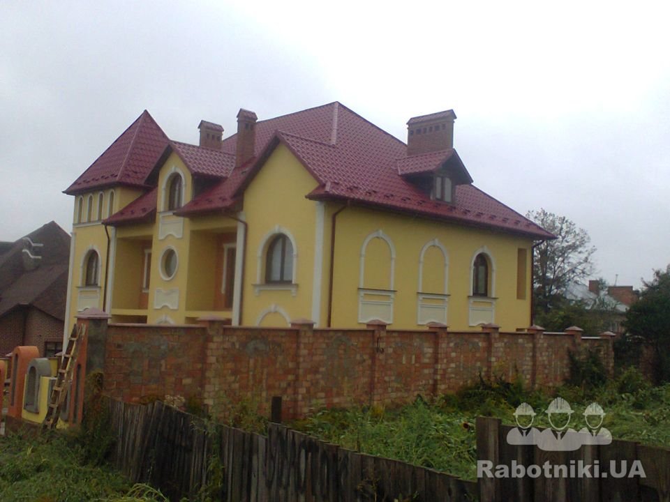 Дизайн дома 650 м2 і участка з подальшим утепленням мінватою, армування сіткою, шпаклювання клеєм під короїд і барашек, виготовлення і встановлення фасадніх елементів, нанесення барашика і короїда. Бетонні роботи на тереторії, одмостки. огорожі, обличювання каменем, інші роботи.