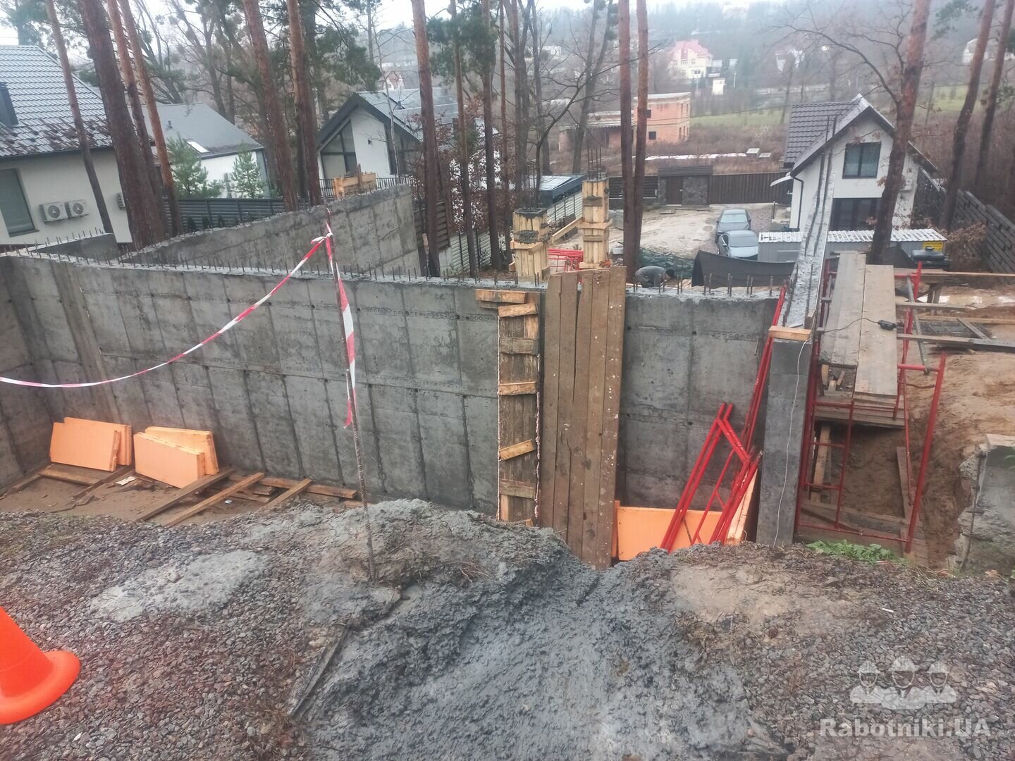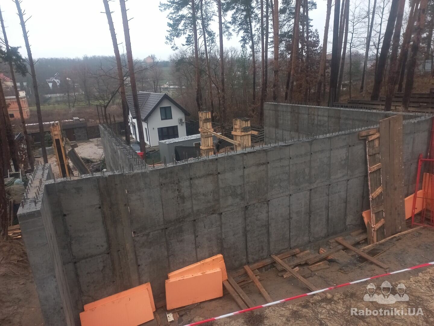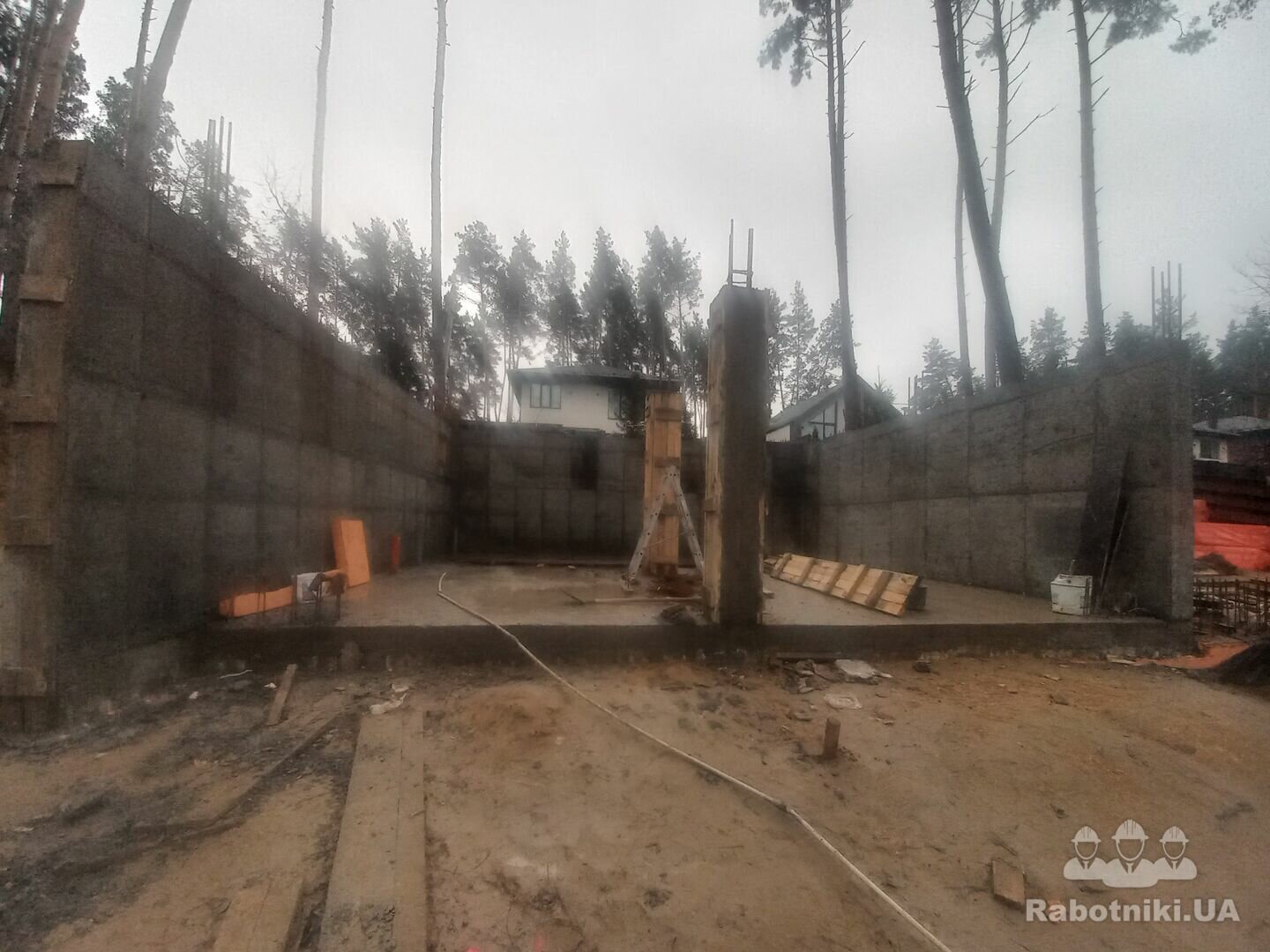Поставити закріпити опалубку на готових стінах, заармувати згідно проекту, залити бетон з бетононасосу.
