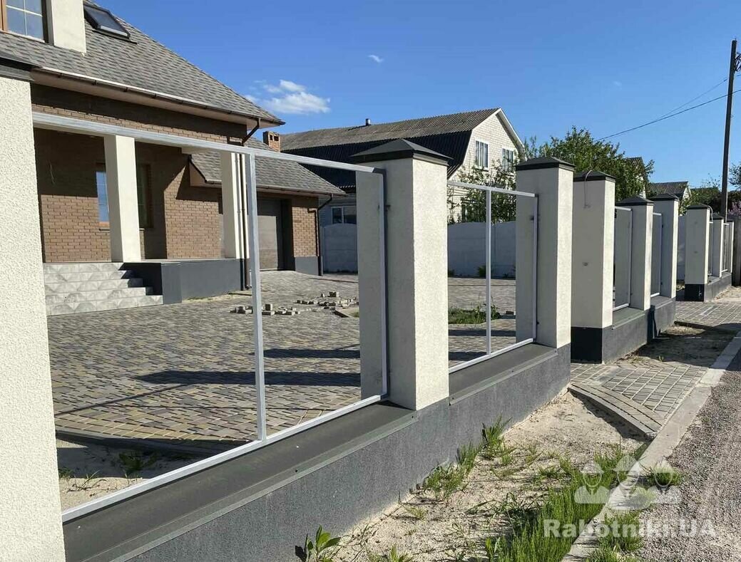 Будівництво паркану, стовпи цегляні (поштукатурити, нанести барашик), прольоти металопрофіль, ворота розпашні