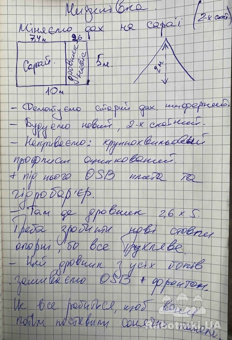 Матеріали на обʼєкті.Знаходиться в с.Мизинівка Звенигородського району. Потрібно демонтувати старий , поставити новий 2-х скатний дах на сараї розміром 5х10 м. Потрібно нашити осб і вкрити оцинкованим профлистом, Дровник 2,6 х 5 зашити стіни ОСБ.
