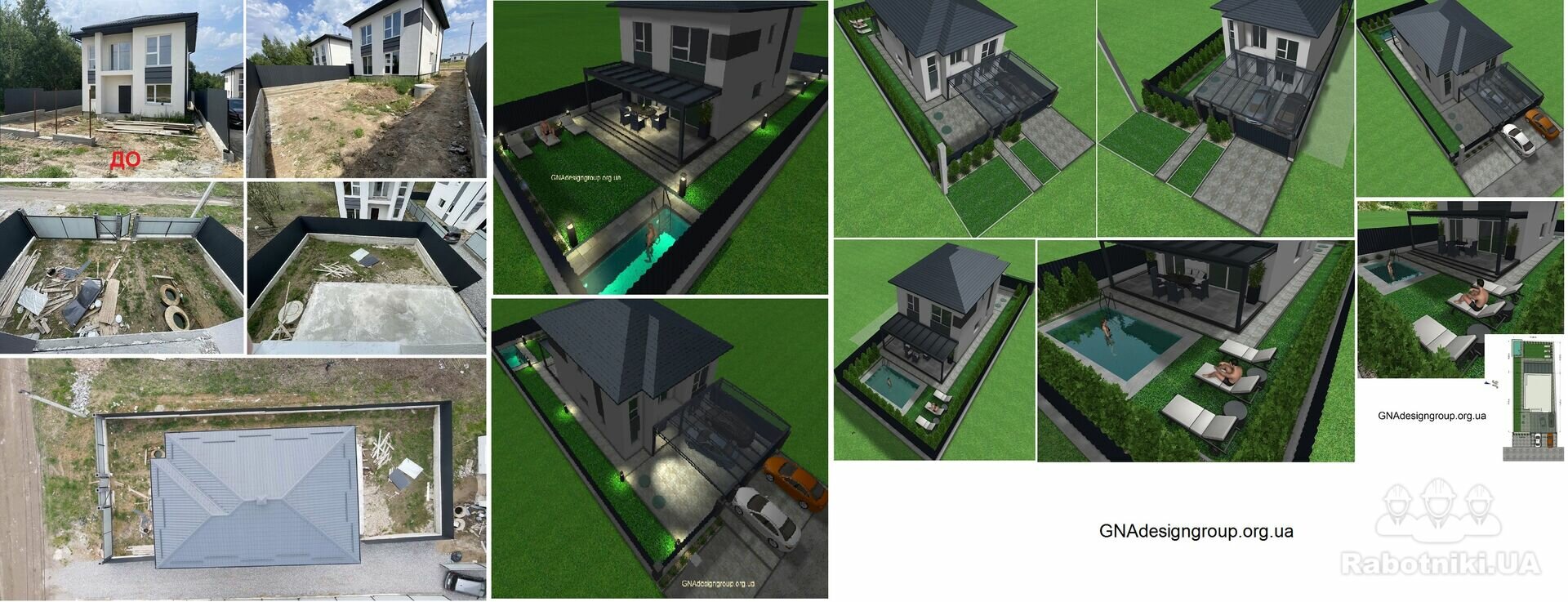розробка тераси, навісу/накриття, різноманітних зон відпочинку, вхідної/в їздної групи (паркан, хвіртка, навіс і т.д.), парковки (критої / відкритої), підбір рослин та тротуарної плитки, доріжок, моделювання індивідуальних локацій і т.д., 3д візуалізацію цього, 2д плани, освітлення і т.д.