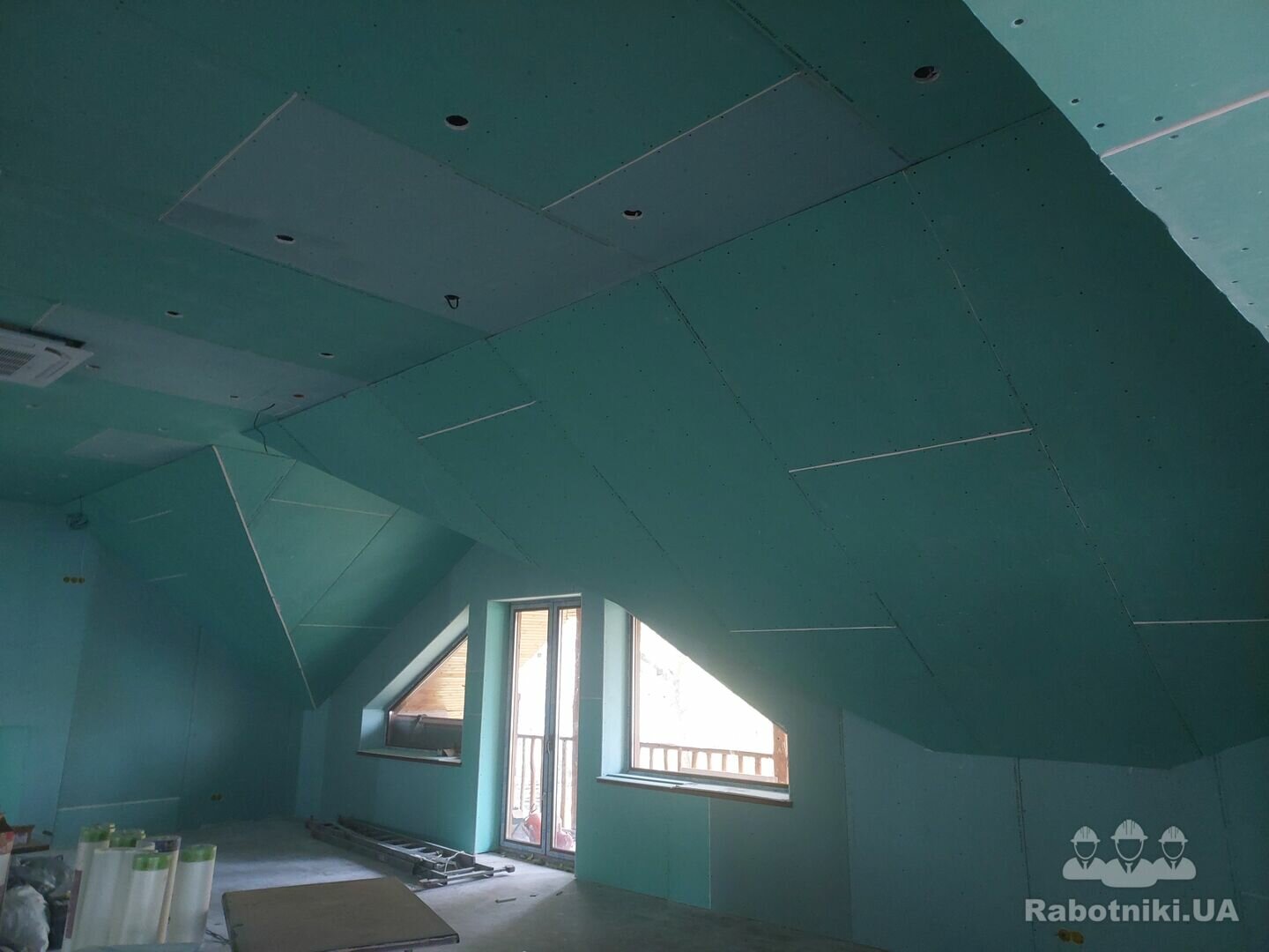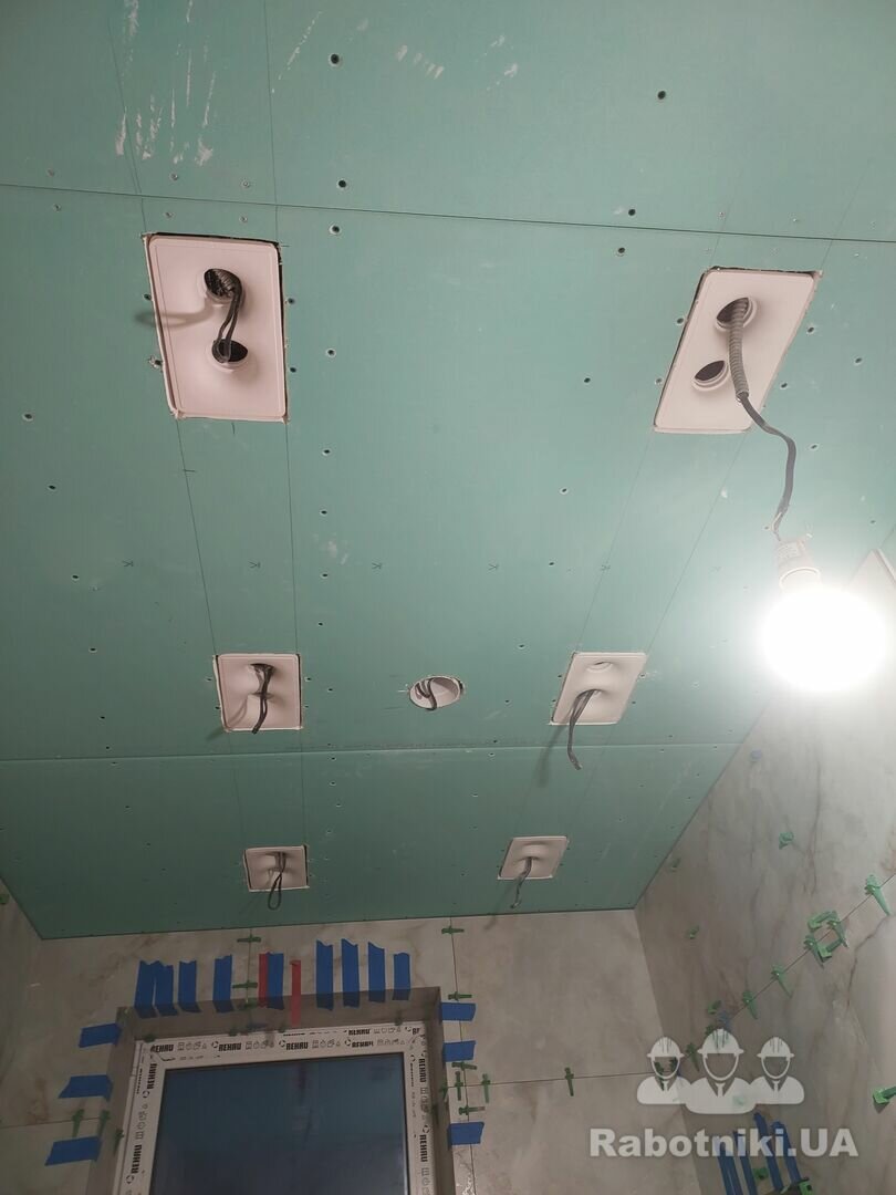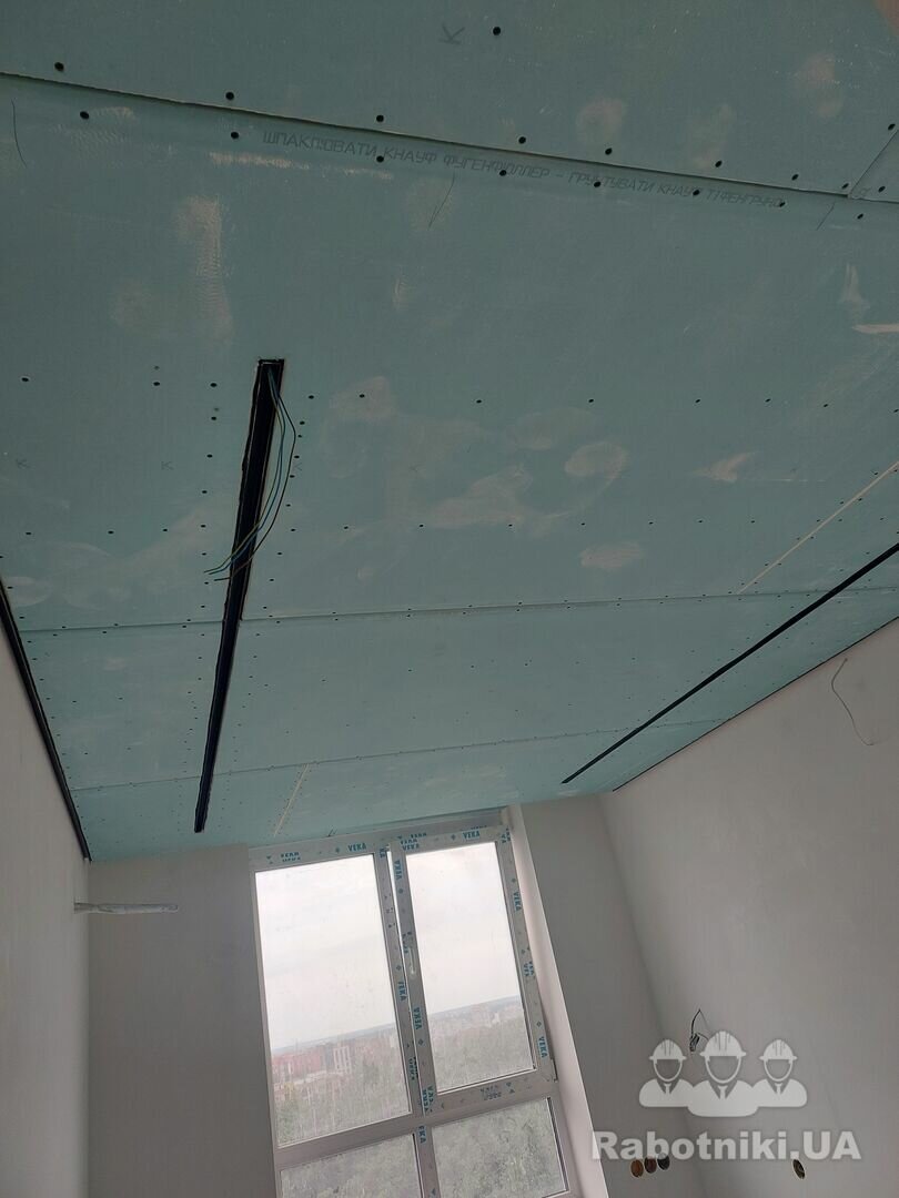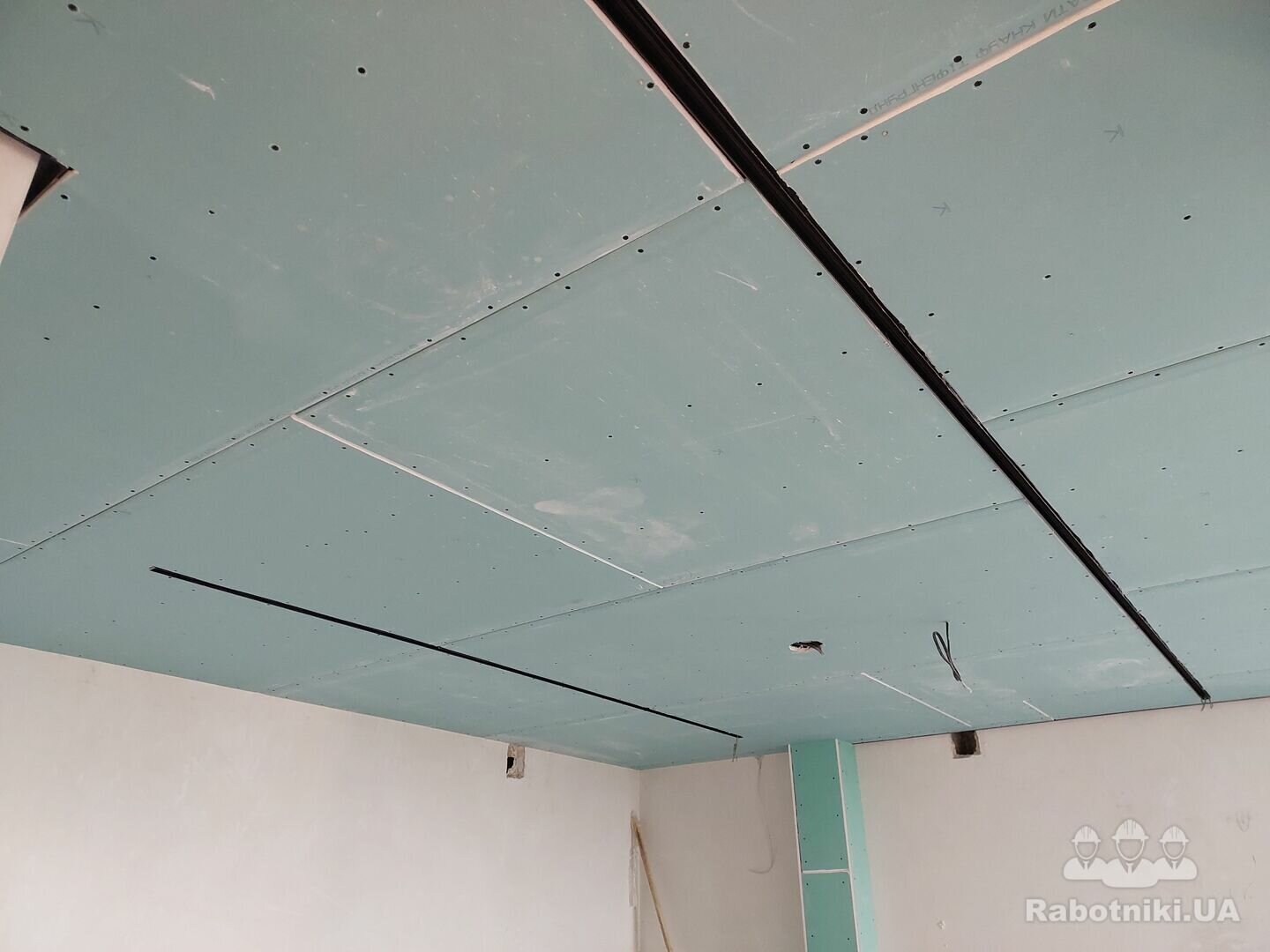Монтаж гіпсокартону( стеля), тіньовий пролфіль з підсвіткою, гіпсові світильники ,та ревізійний люк 800*800мм під кондиціонер. м.кв - 16, м.п - 5.