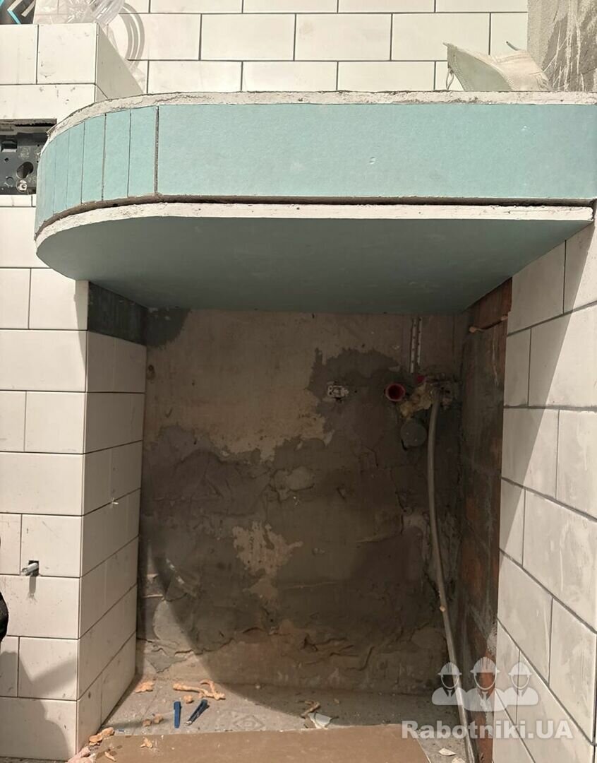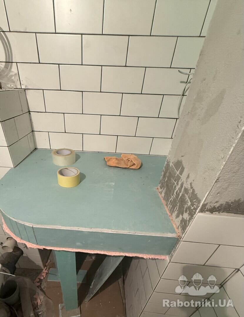 Обкласти плиткою стійку під умивальник (прикріплюю фото) та докласти плитку на стіні у вбиральній. Потрібно почати роботу 27.10