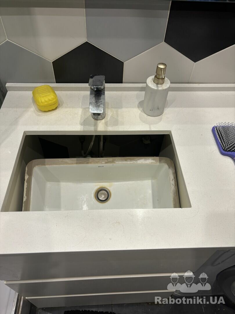 Треба приклеїти раковину під стільницю, перед цим зняти старий клей, із матеріалів немаю нічого, можливо під час того як відклеілась пошкодила трубу