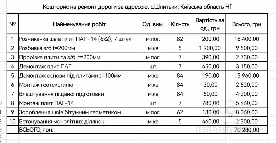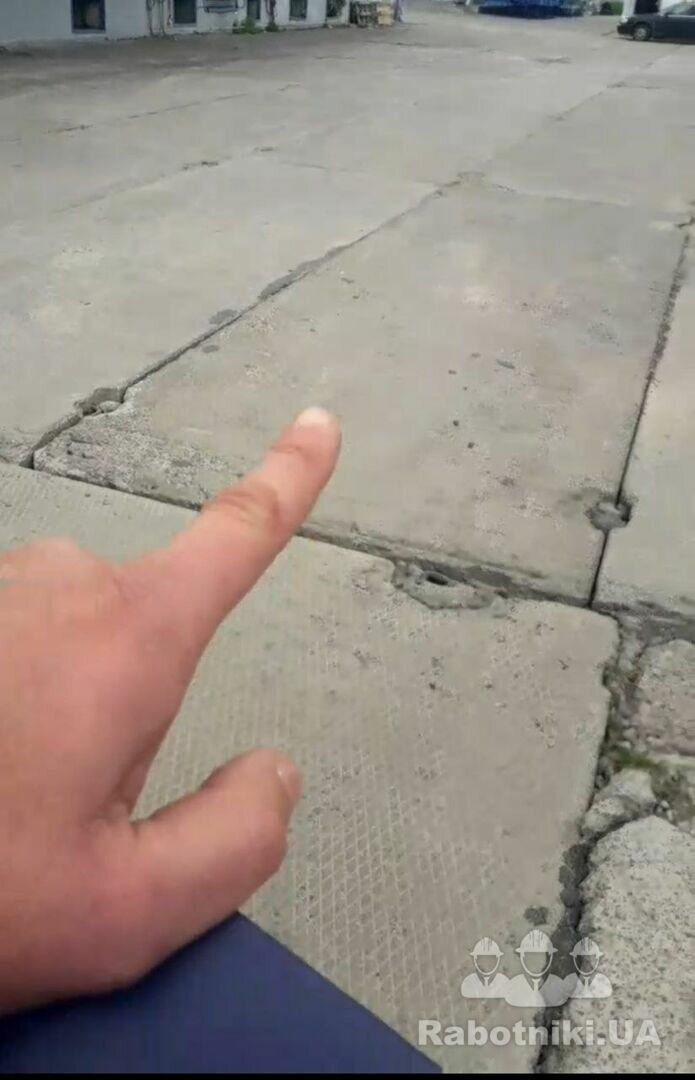 Треба виконати ремонт покриття з дорожних плит на території виробничого підприємства в селі Шпитькі (це по Житомирській трасі в районі сіл Мила і Мрія). Всі матеріали та техніку надаємо. Проживання можливо на території підприємства. Кошторис та фото у вкладенні!