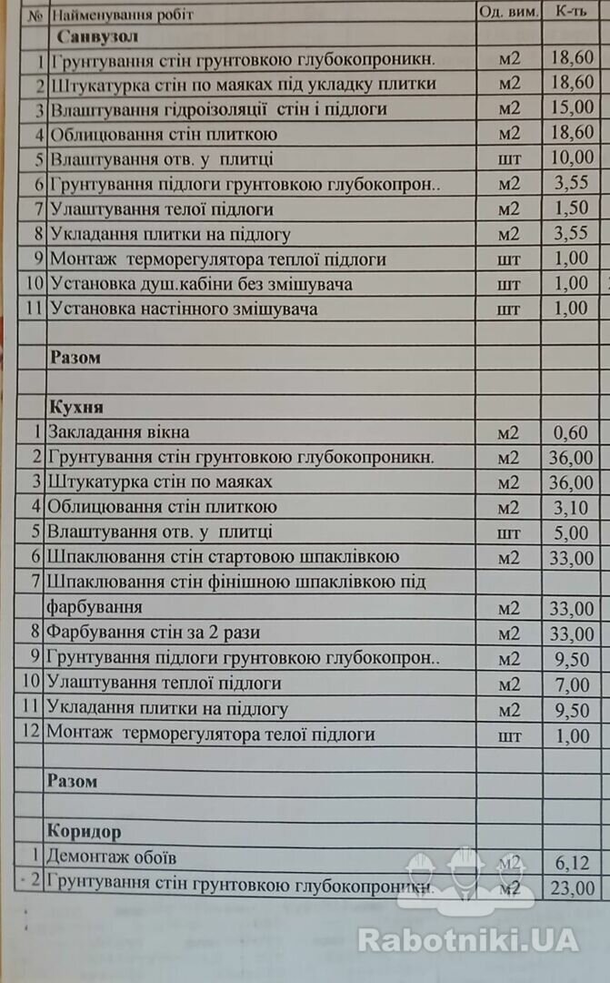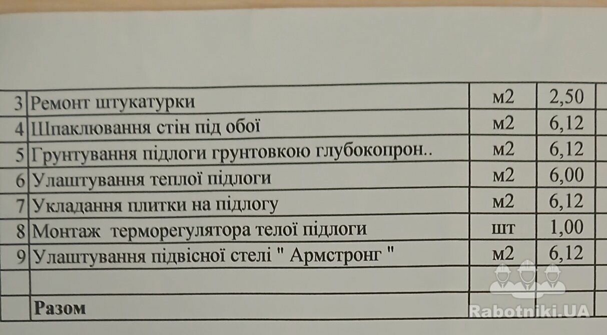 Штукатурка стін,укладання плитки (підлога,стіни)теплі поли,встановлення душової кабіни