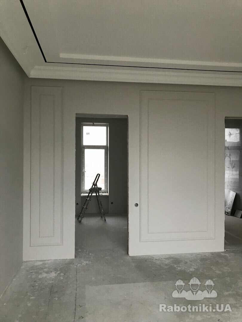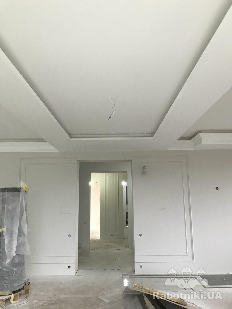 Стеля гіпсокартон ,підлога в плитціт та ламінат,стіни фарбуємо