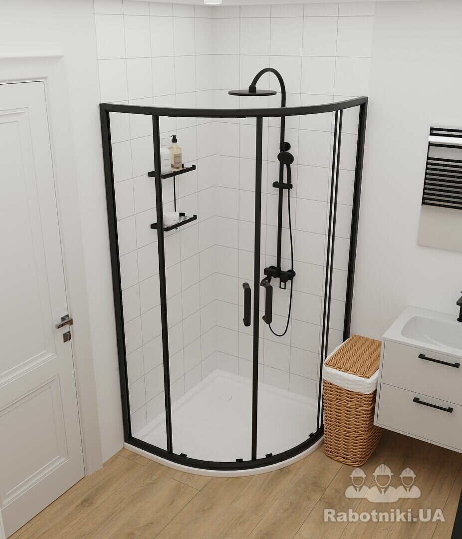 Работы: возведение 2 стен из газоблока, установка двери, монтаж душевой кабины, умывальника, унитаза, зеркала, подключение сантехники и электрики, шпаклёвка и покраска стен (плитка только в душевой зоне).